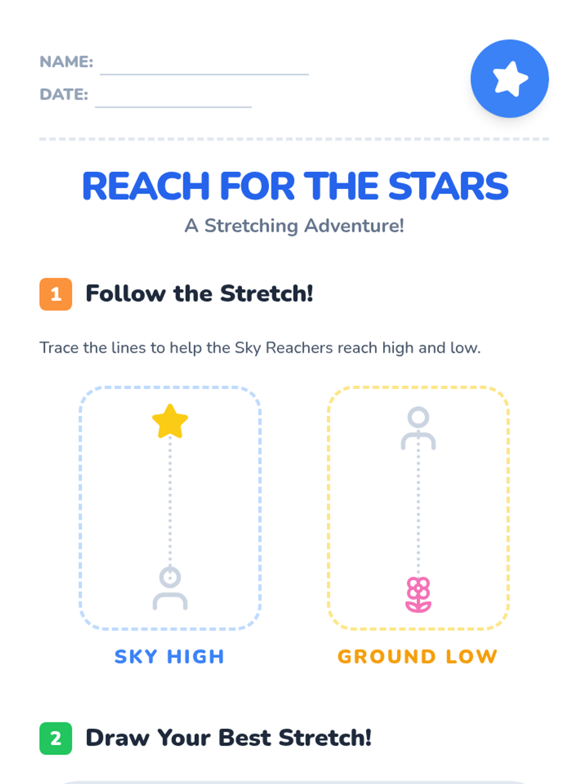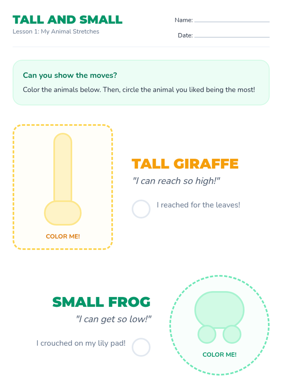A Pre-K sequence introducing flexibility and body awareness through imaginative animal-inspired movements. Students explore vertical, lateral, seated, and rotational stretches to improve gross motor control and learn how to cool down their bodies.