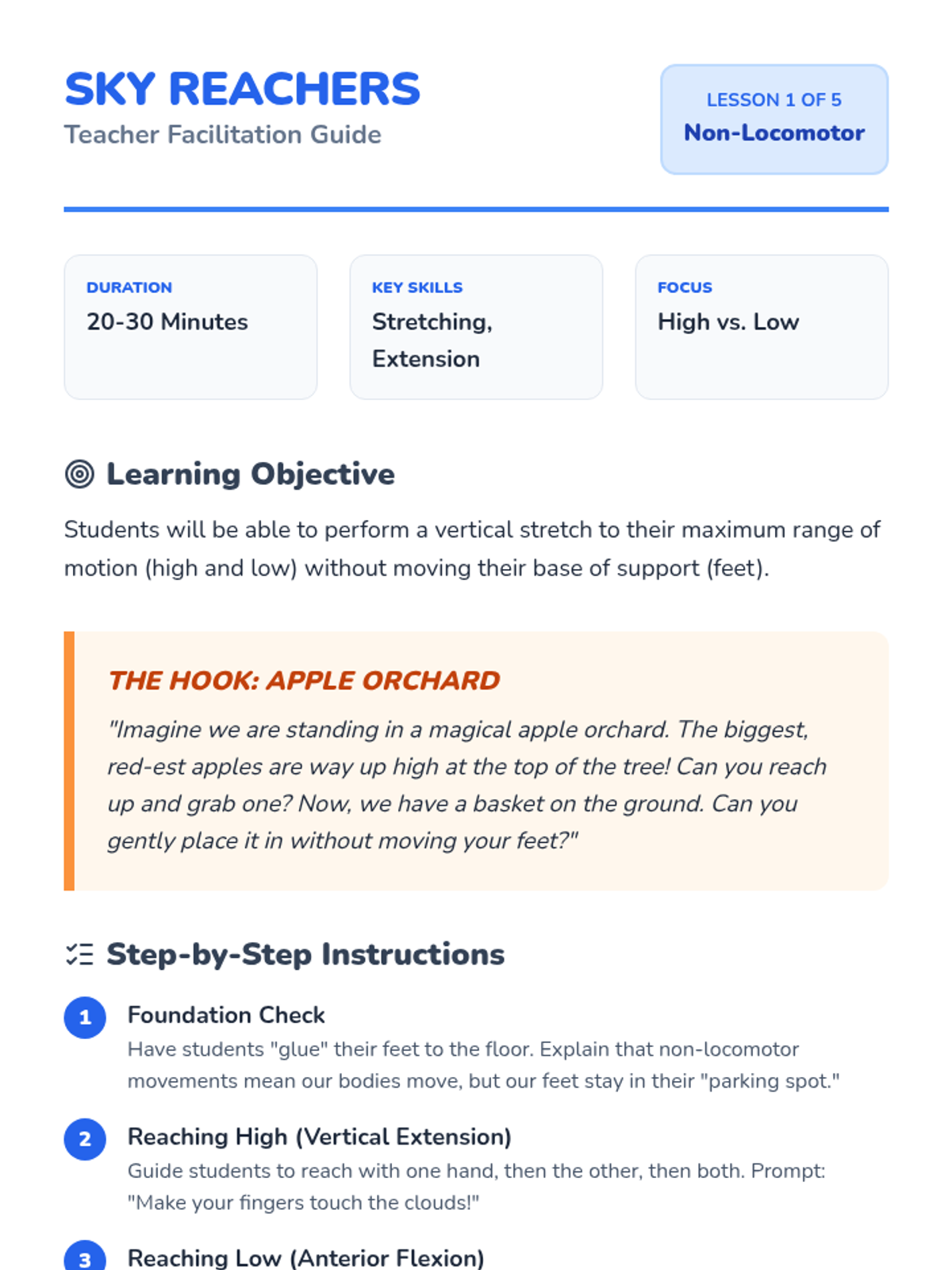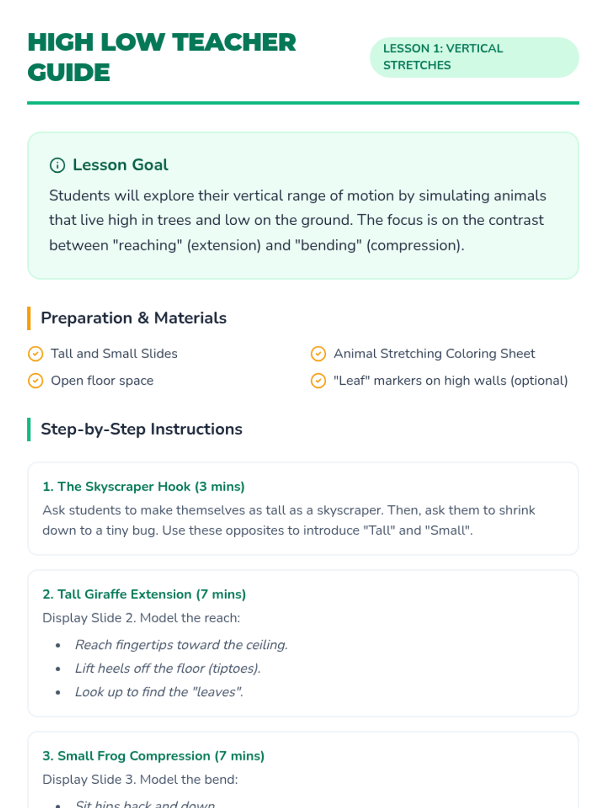 A physical education sequence for Pre-K students that uses animal mimicry to teach flexibility, stretching, and body awareness. Students explore vertical extension, core rotation, and dynamic movement through playful jungle-themed activities.