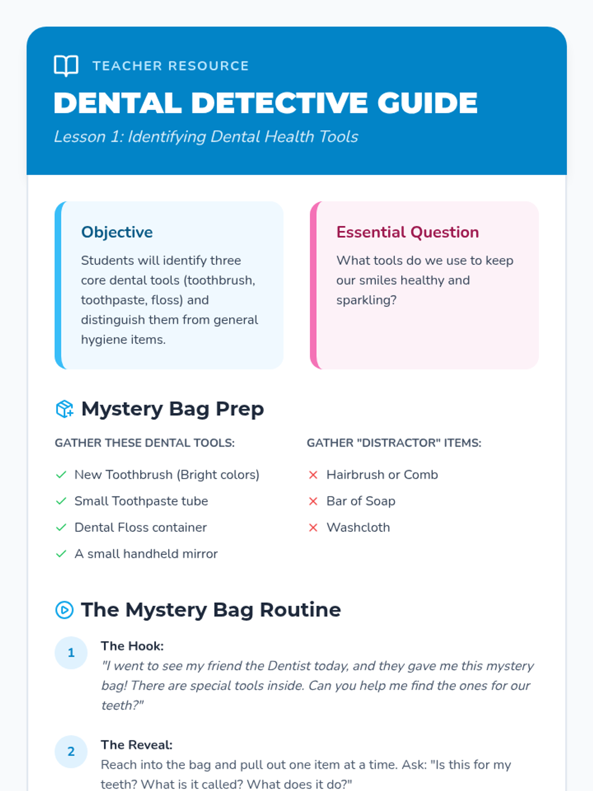 A comprehensive 5-lesson unit for Pre-K students focused on dental hygiene, nutritional choices for oral health, and daily self-care routines. Through interactive games, hands-on practice with models, and role-play, students develop the motor skills and vocabulary needed to take charge of their own personal hygiene.