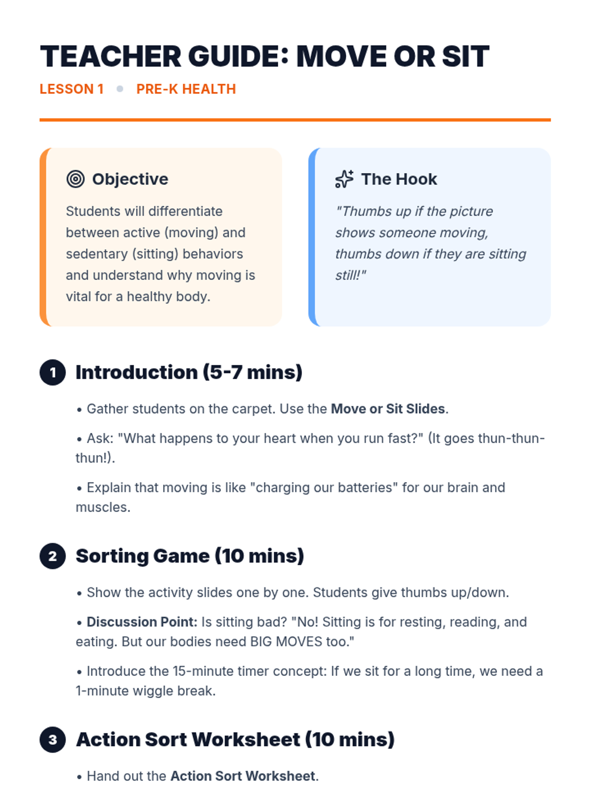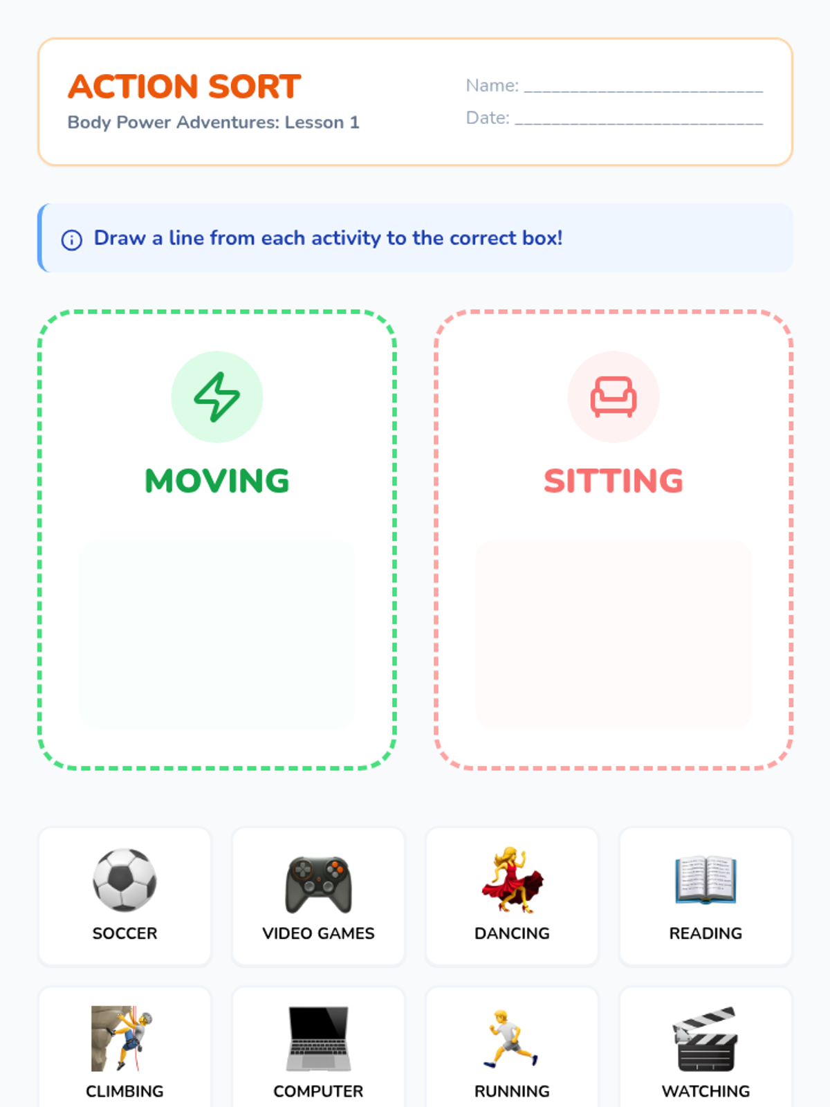 This project-based sequence for Pre-K students focuses on differentiating between active play and sedentary behaviors. Through five interactive lessons, students learn to categorize activities, integrate movement into their daily routines, explore outdoor play, try new physical skills, and create a visual 'Active Day' plan to encourage lifelong healthy habits.