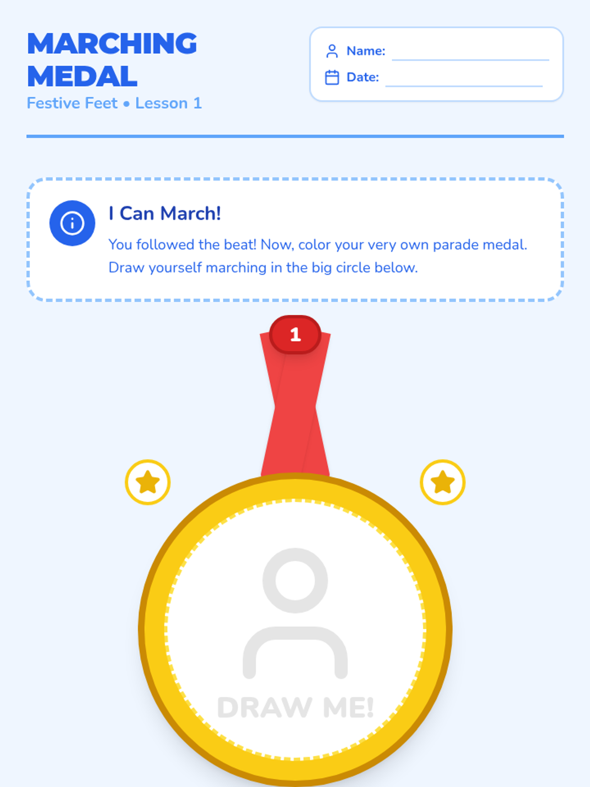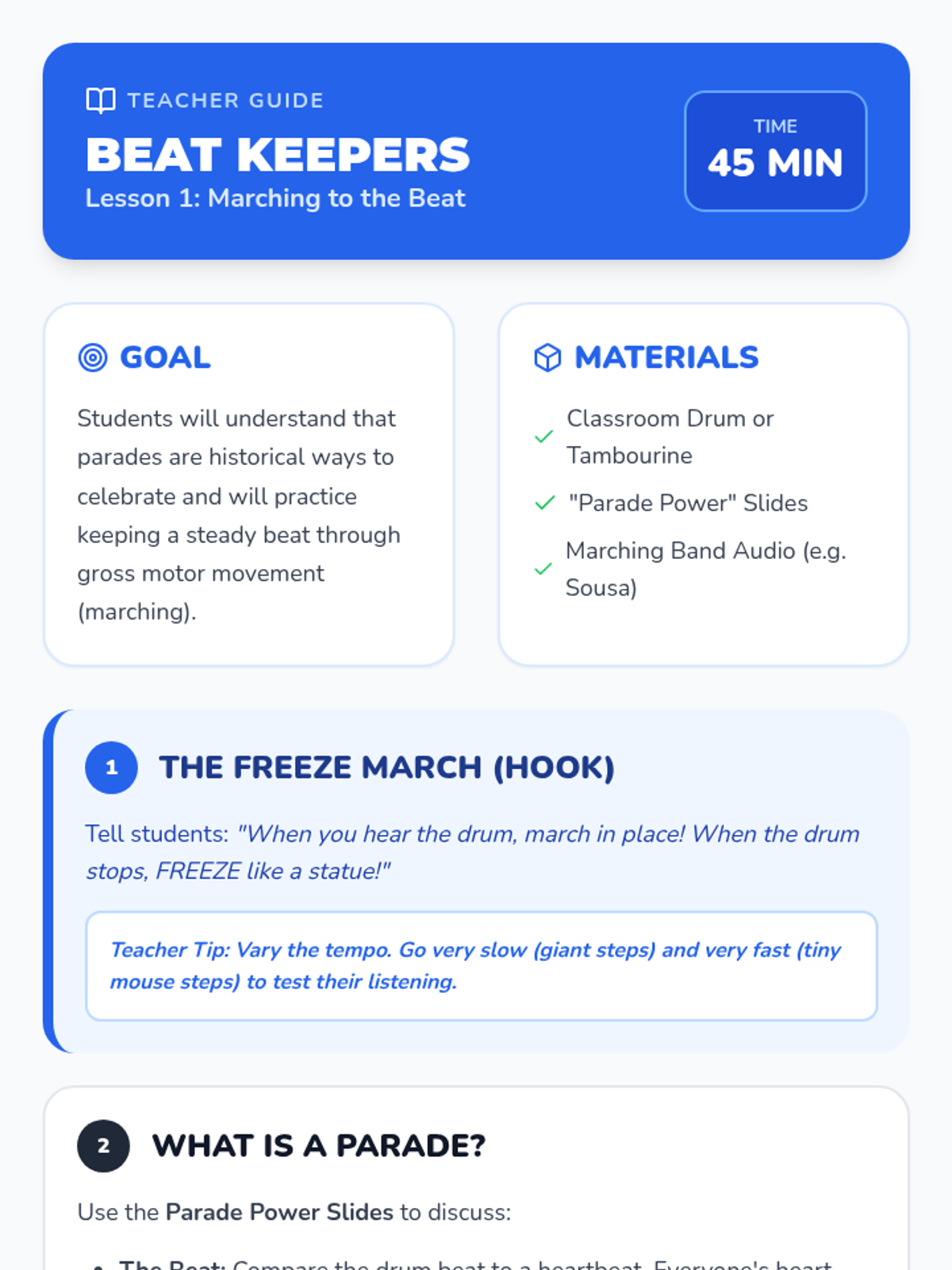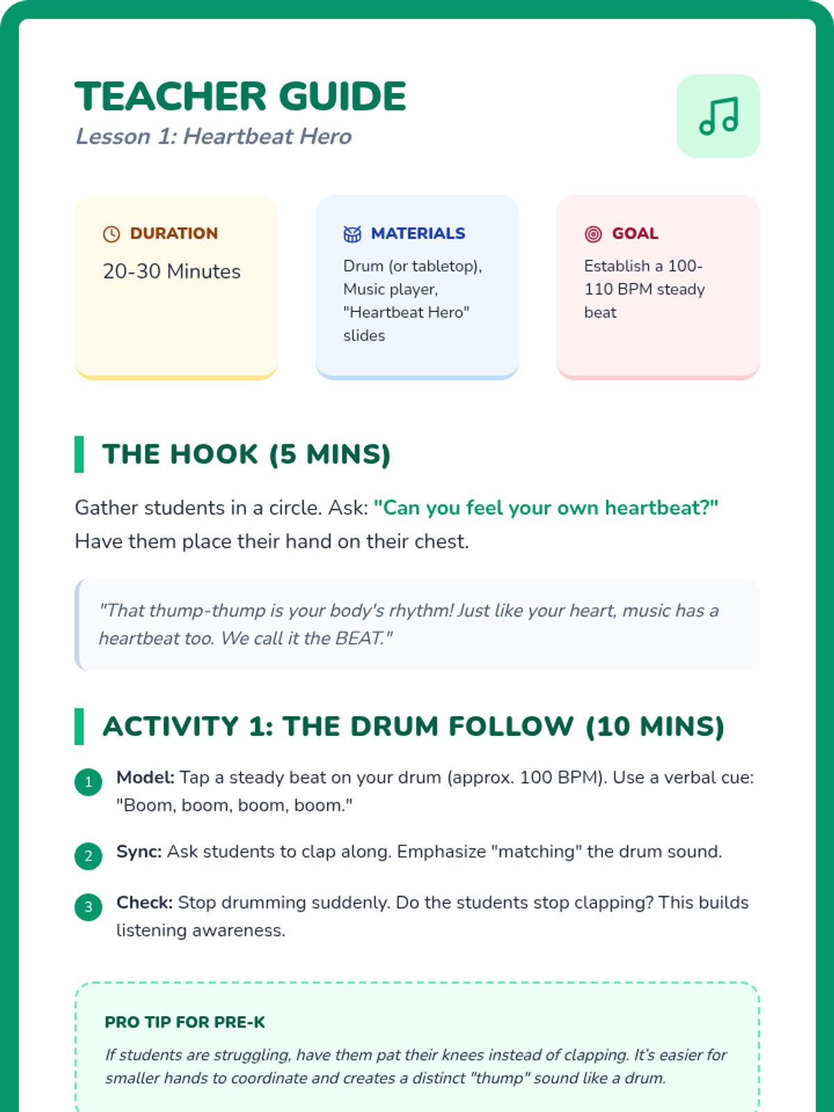 A sequence for Pre-K students focused on developing rhythmic awareness through auditory discrimination and movement synchronization. Students explore the concepts of steady beat, marching in time, tempo (fast/slow), impulse control (freeze dance), and body percussion patterns.