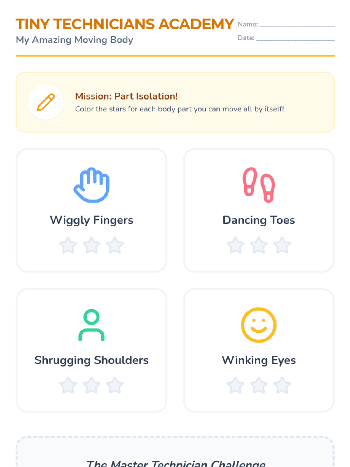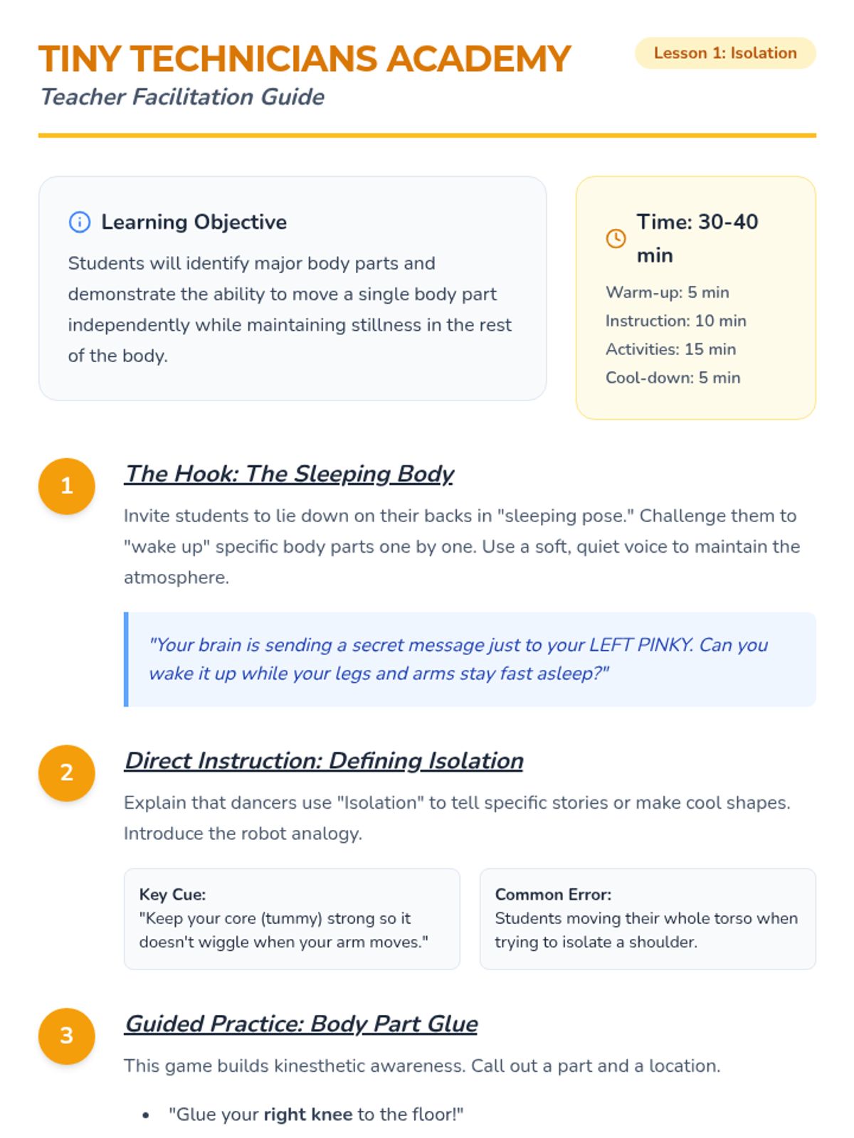 This sequence introduces Pre-K students to foundational dance mechanics, focusing on body awareness, balance, foot articulation, and safe jumping techniques. Students progress from isolating body parts to mastering controlled movement and stillness.