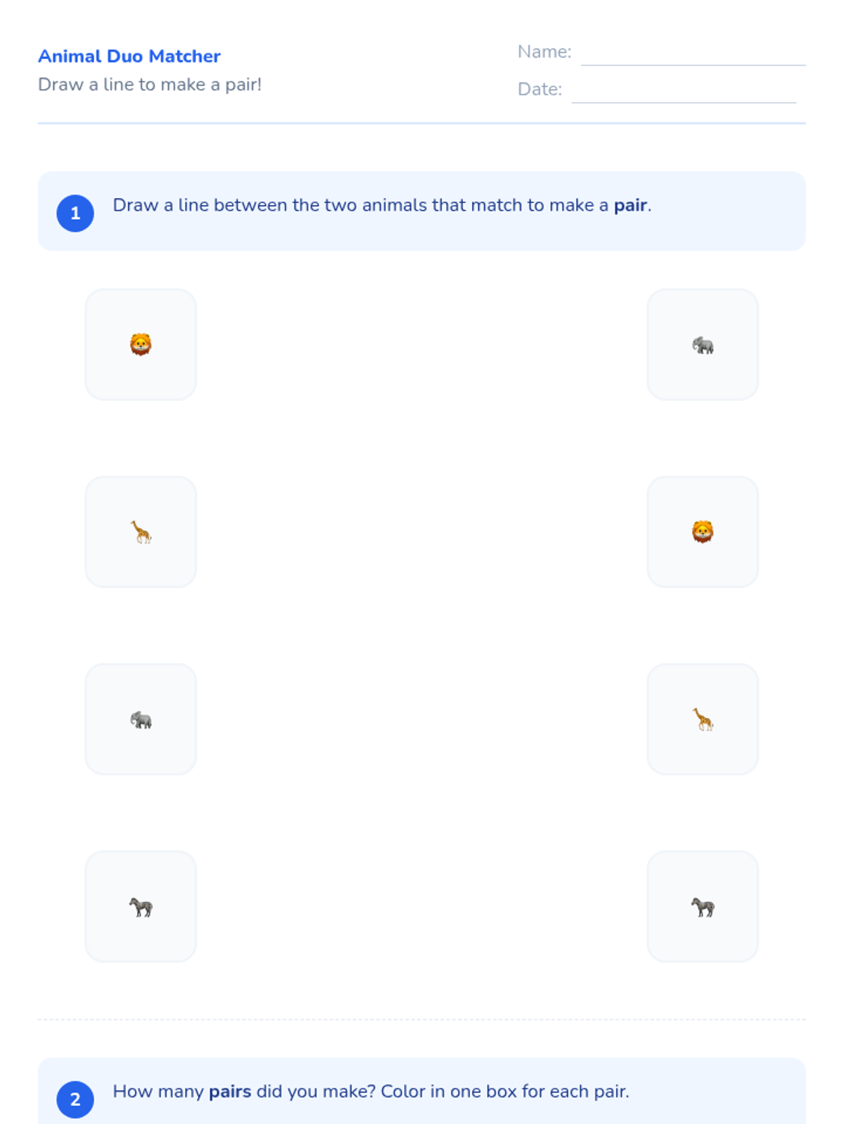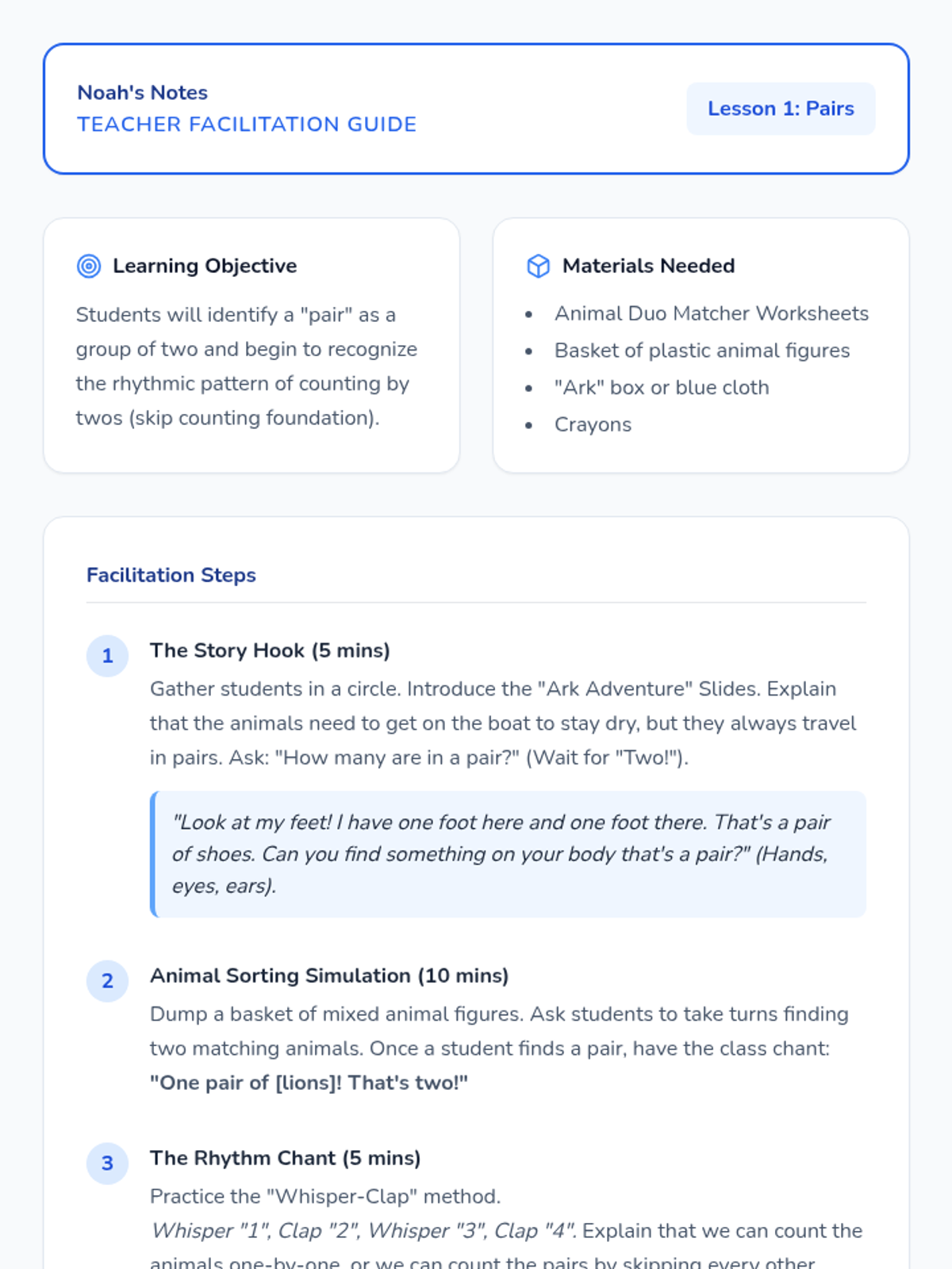 This sequence introduces Pre-K students to the concept of grouping by pairs and fives, laying the foundation for skip counting through movement, rhythm, and hands-on sorting activities.