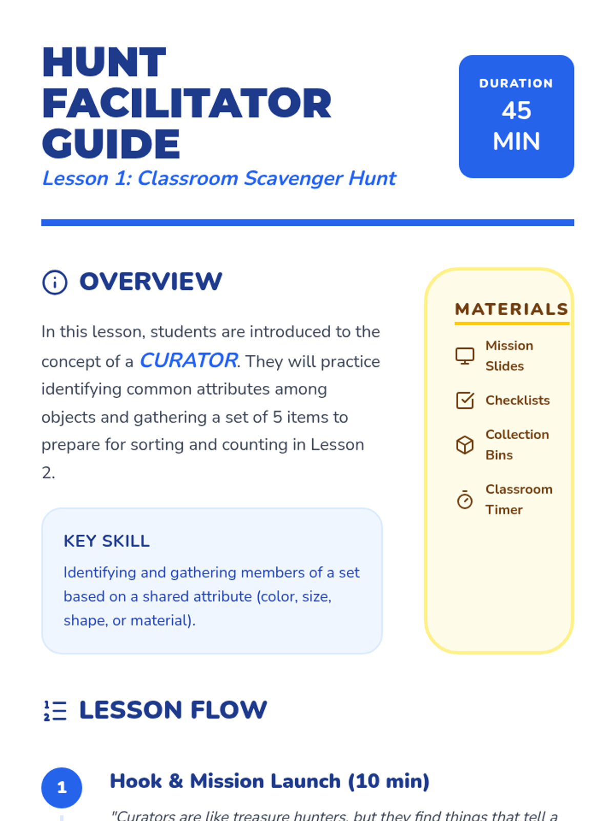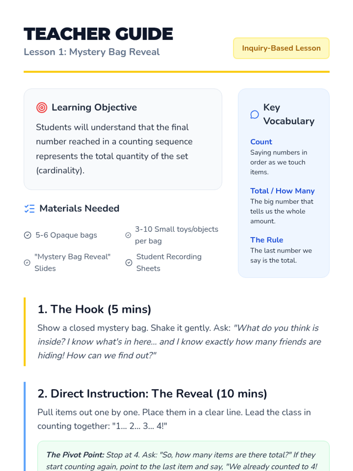 This inquiry-based sequence transitions Pre-K students from counting to understanding cardinality. Through hands-on collection activities and games, students learn that the last number counted represents the total quantity.