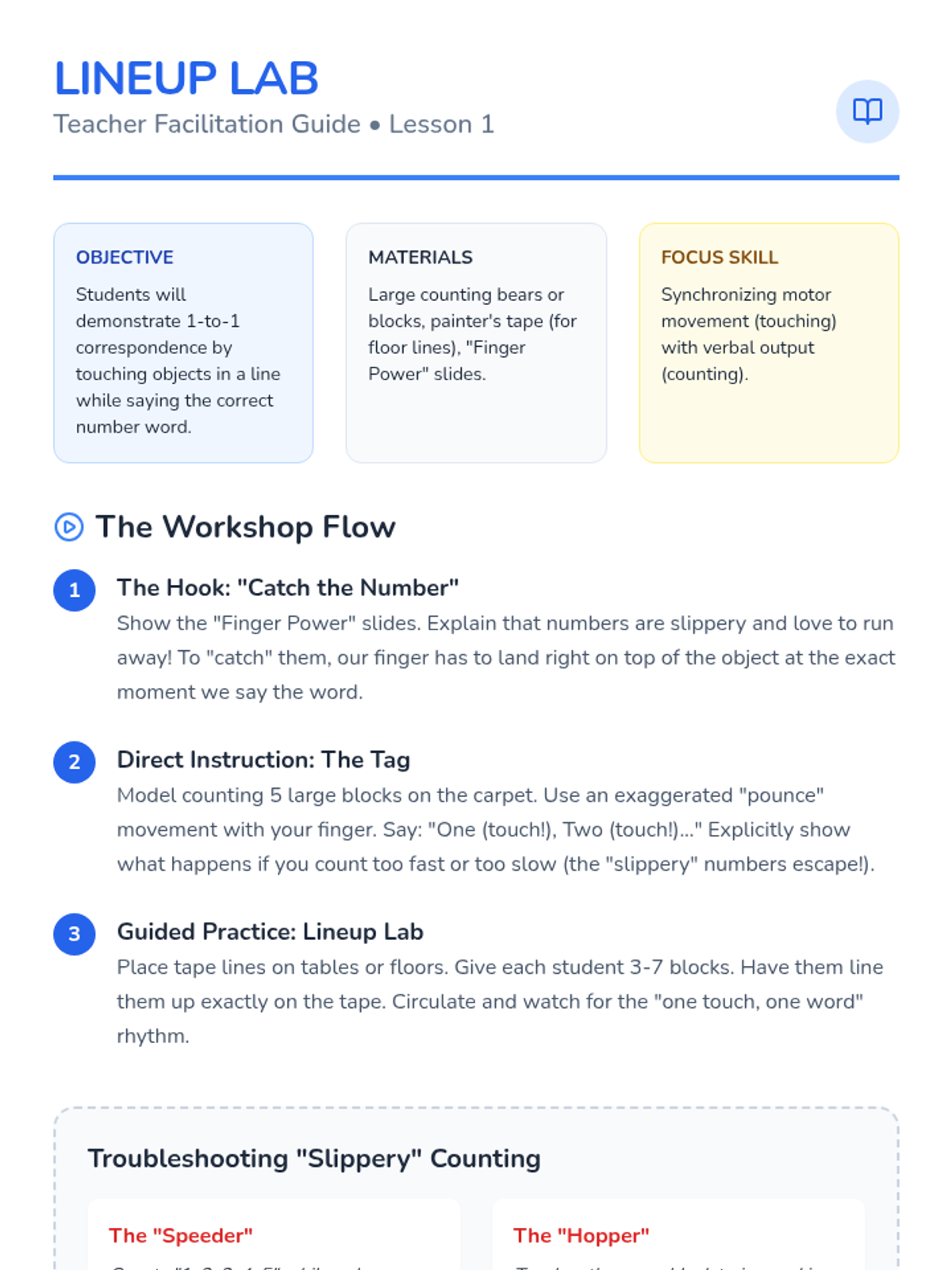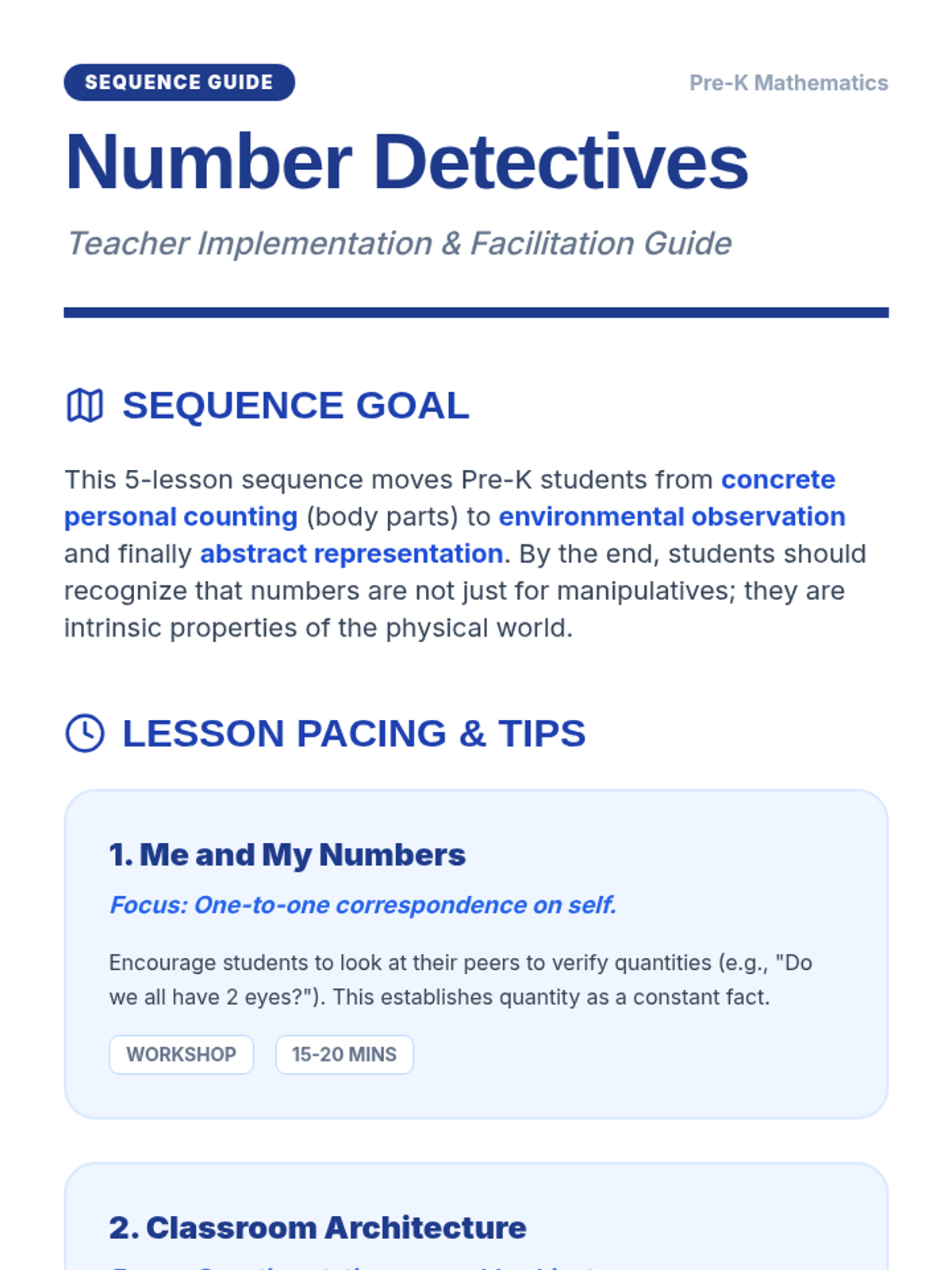 A comprehensive Pre-K sequence focused on mastering one-to-one correspondence. Students progress from linear counting to managing scattered sets and identifying counting errors through tactile play and guided instruction.