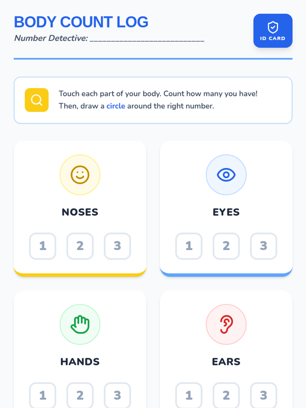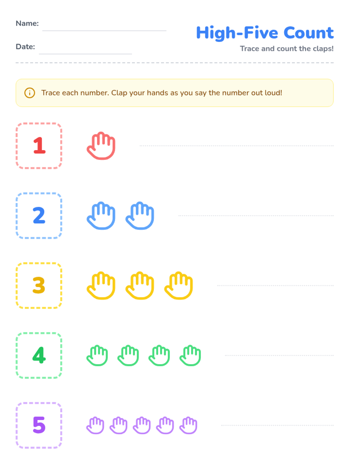 A sensory-rich, game-based introduction to the number names 1 through 5 for Pre-K students. This sequence focuses on associating spoken names with physical quantities through body movement, storytelling, and hands-on exploration.