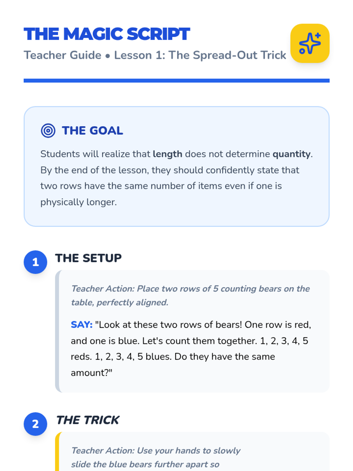 A Pre-K sequence focused on the concept of number conservation. Students explore how moving, stretching, or squishing groups of objects doesn't change their total count through 'magic' experiments and hands-on play.