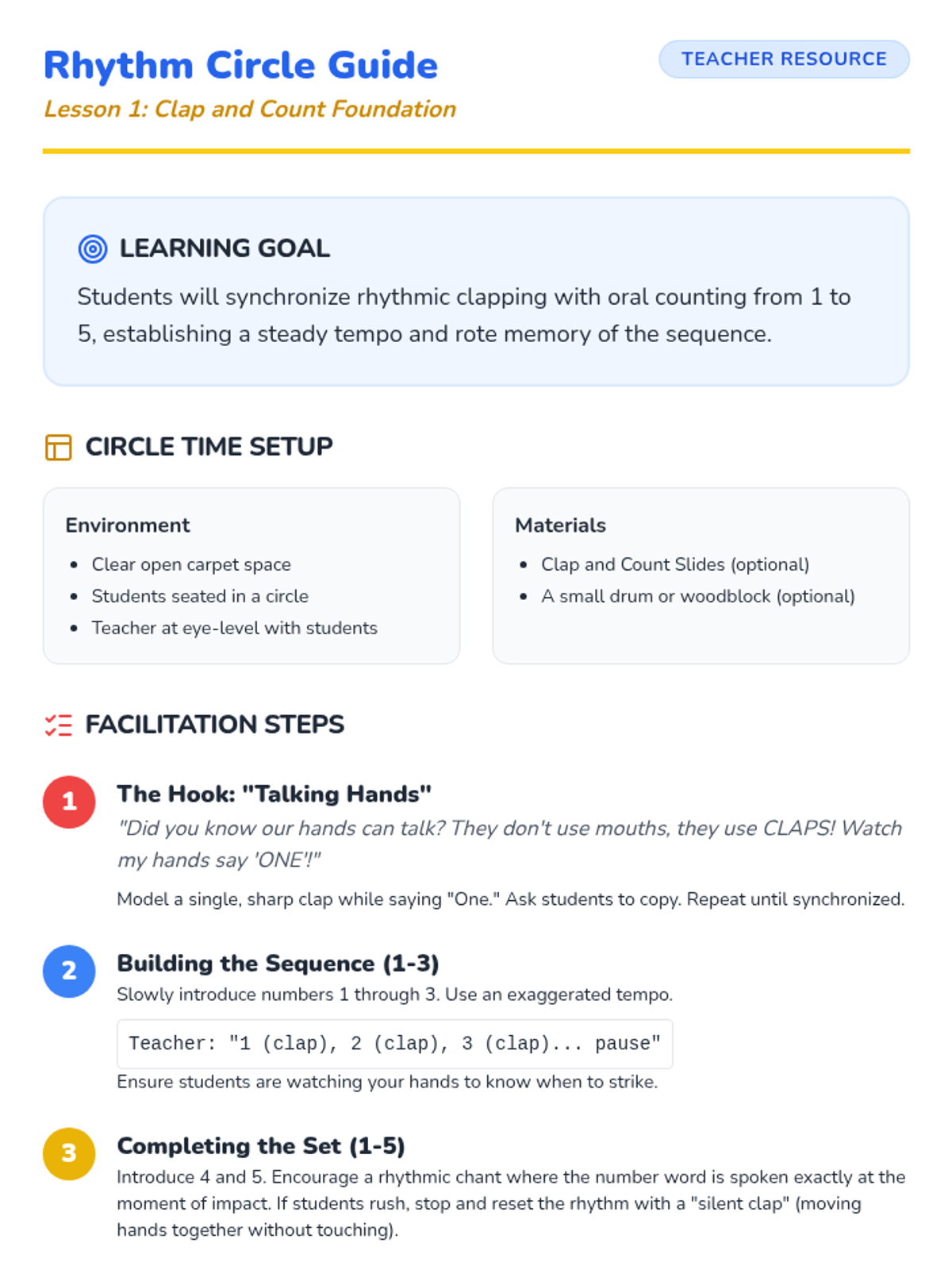 A movement-based sequence for Pre-K students to develop rote counting fluency from 1-10. Through clapping, jumping, and dancing, students build muscle memory and rhythmic synchronization to master the counting sequence.