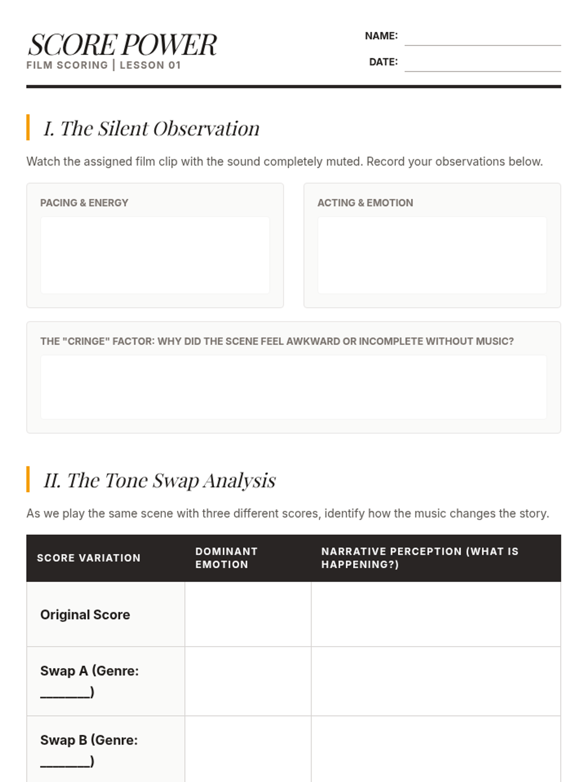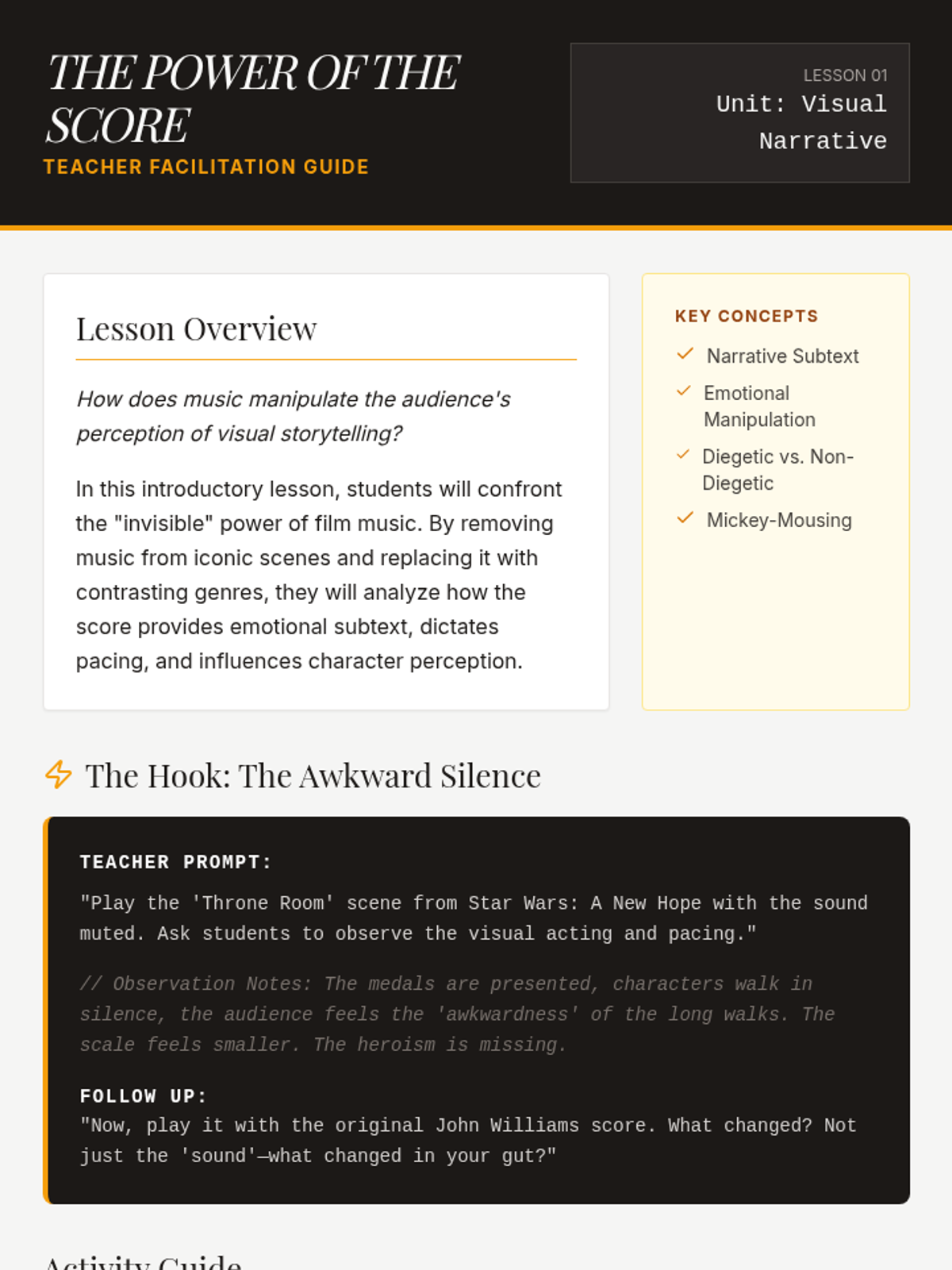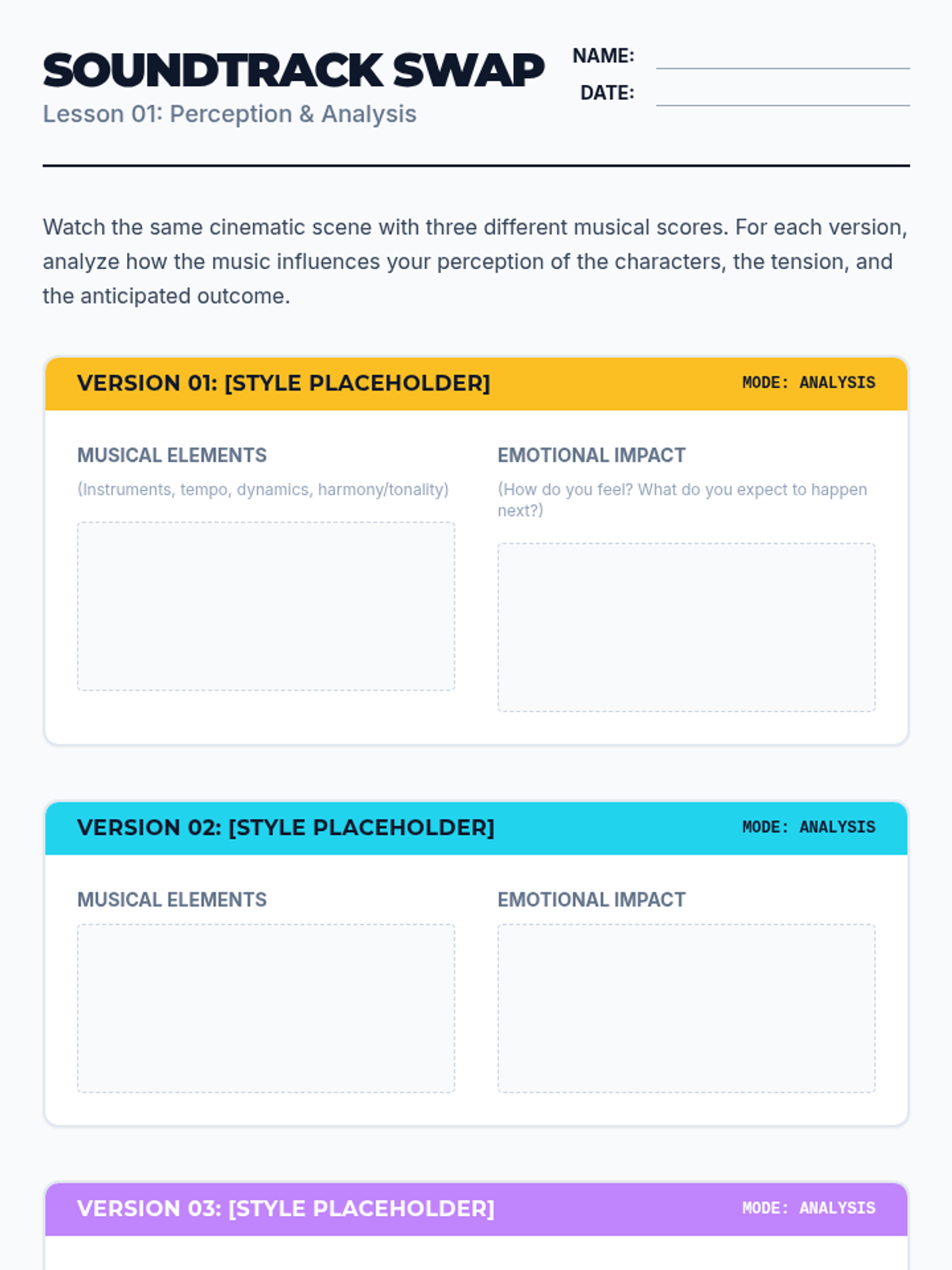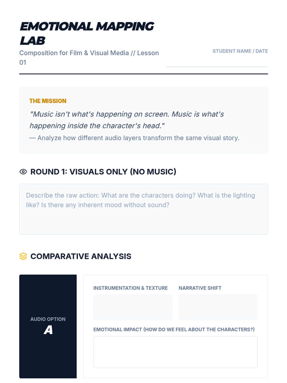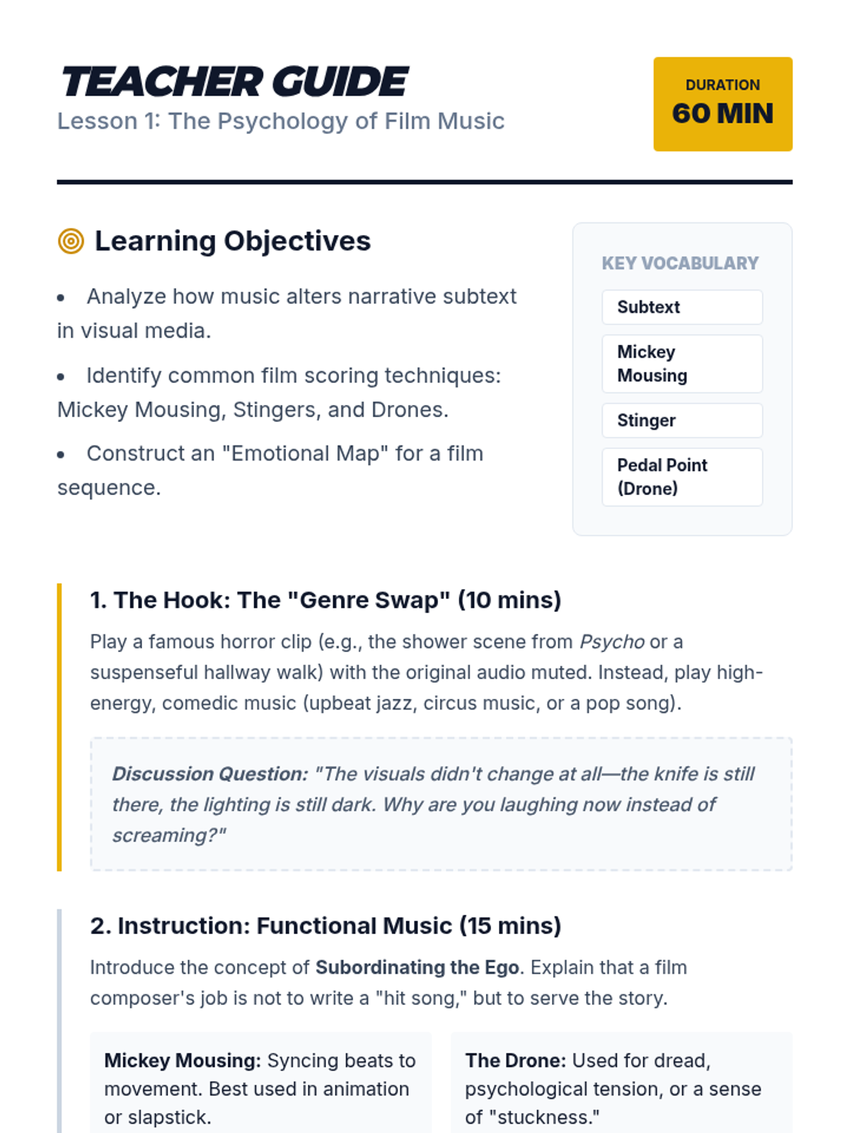 This sequence introduces students to the art of film scoring, focusing on how music influences emotional narrative. Students analyze case studies, create leitmotifs, explore orchestration, and practice synchronization before scoring their own short film clip.