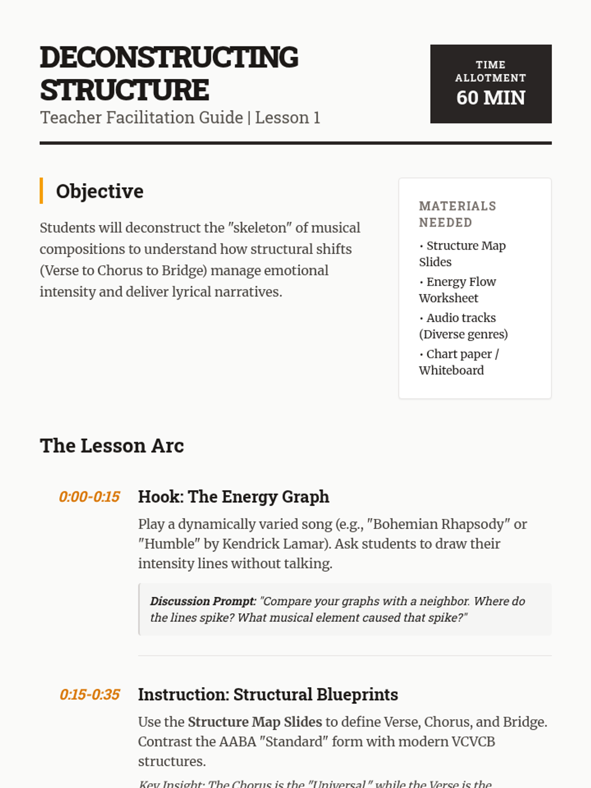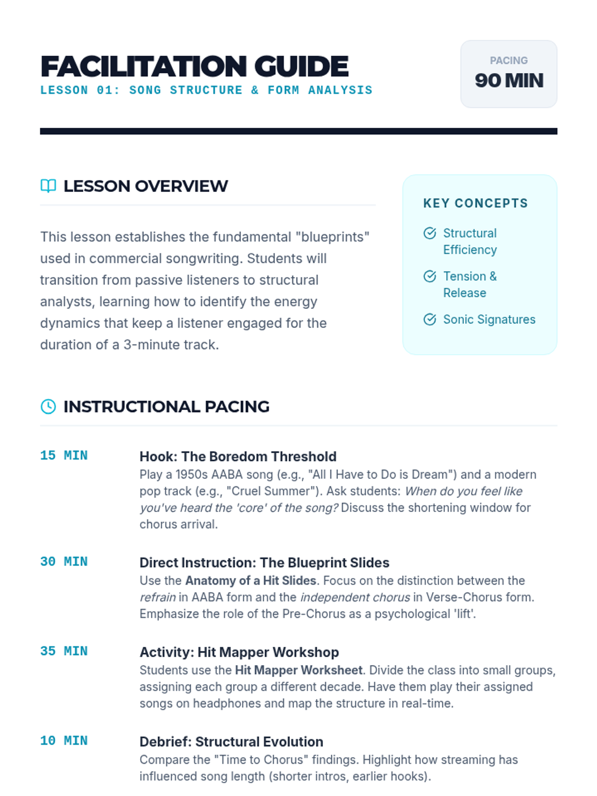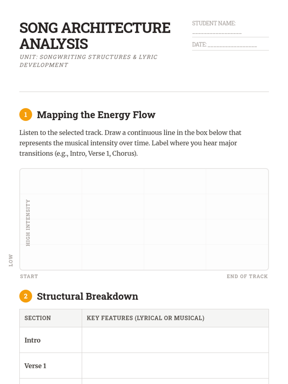 A comprehensive 12th-grade songwriter's workshop focusing on the intersection of structure, lyricism, melody, and harmony. Students move from analytical deconstruction of popular forms to the creation and peer-review of original compositions.