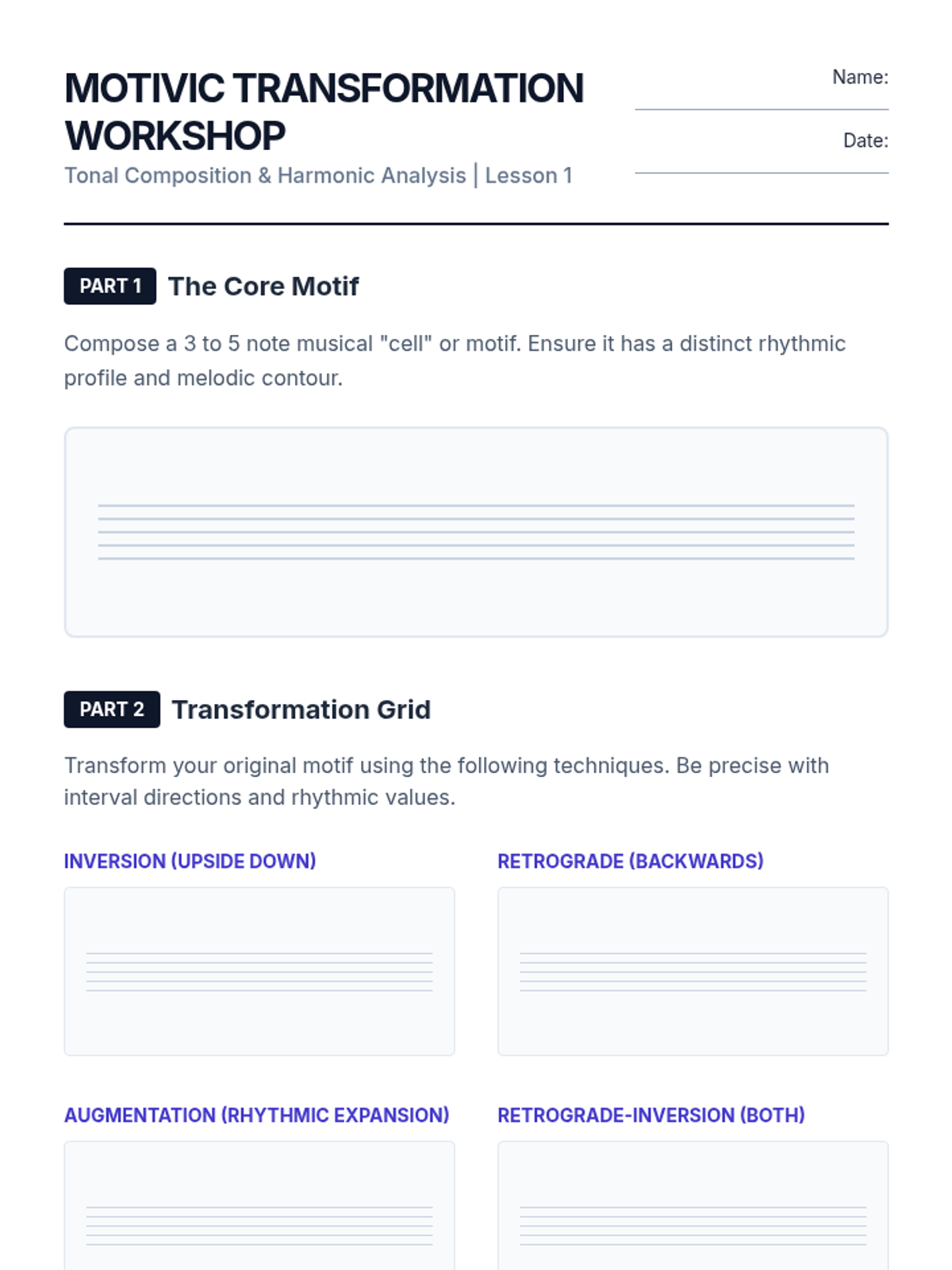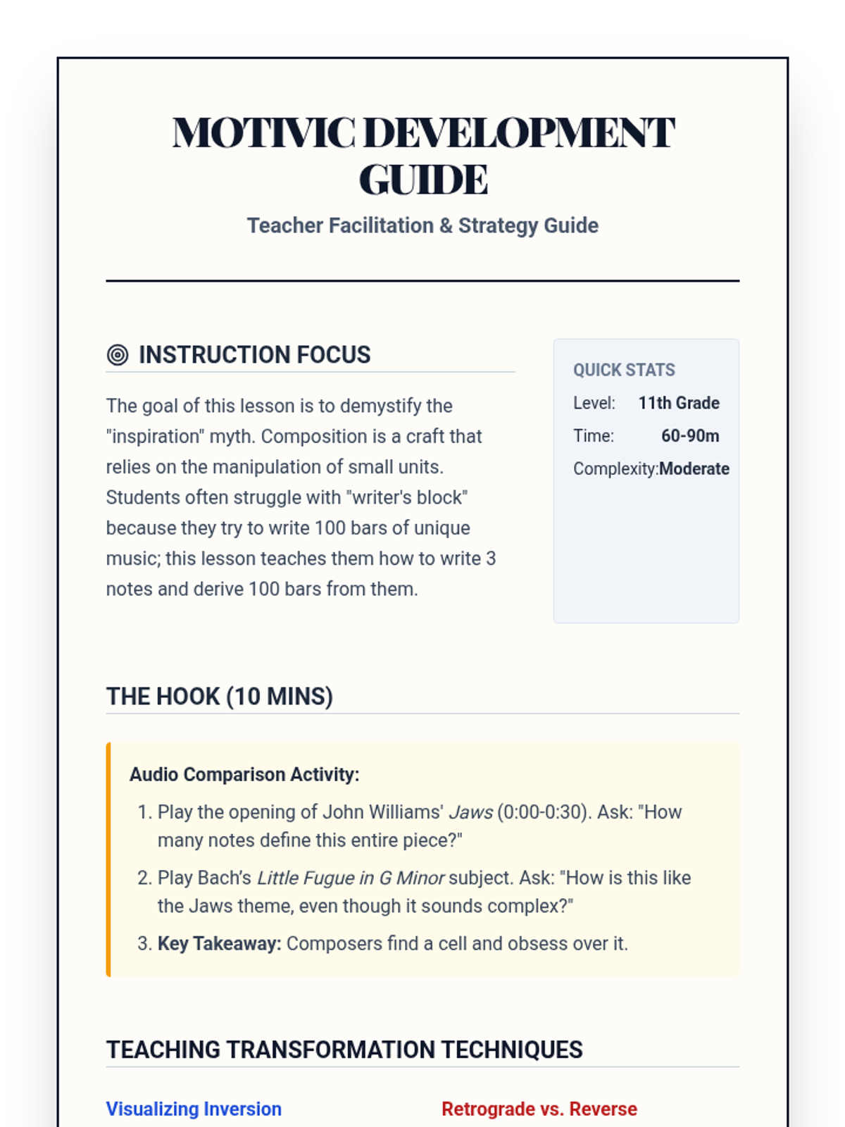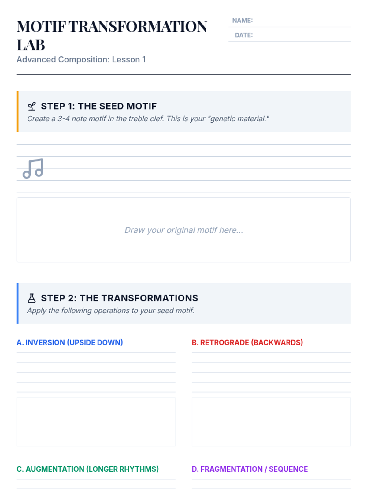 This advanced music theory and composition sequence guides 11th-grade students through the intricacies of motivic development, non-diatonic harmony, and polyphonic textures. Students will move from short melodic fragments to a fully realized ensemble piece, emphasizing the technical and emotional manipulation of musical elements.