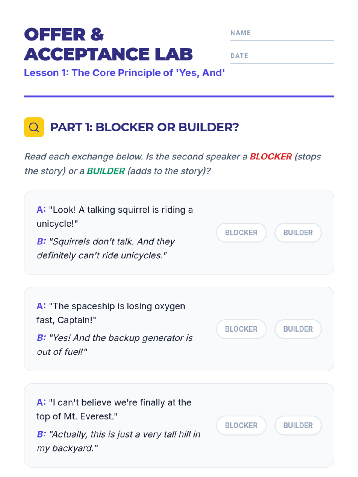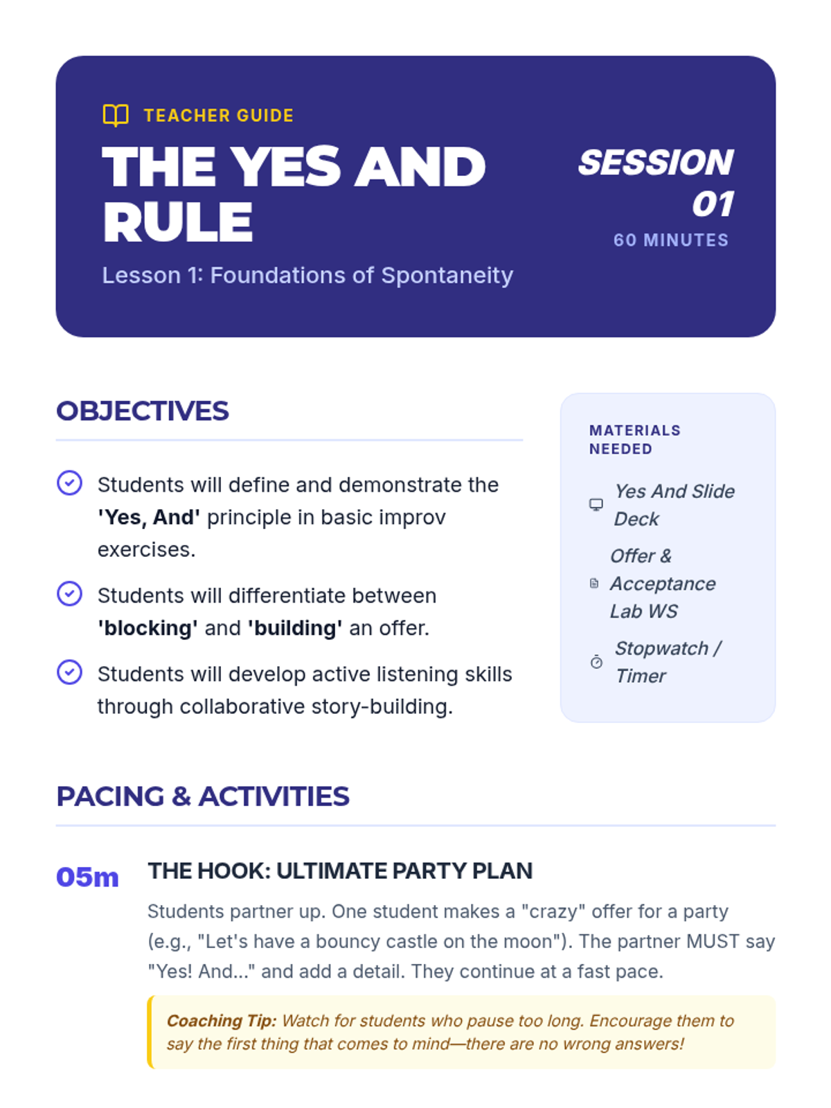 This sequence focuses on improvisation and ensemble building, teaching students to think quickly and collaborate creatively. The arc moves from basic rule-setting (Yes, And) to active listening and reacting in the moment. Students learn to build scenes cooperatively without a script, focusing on maintaining character and narrative logic.