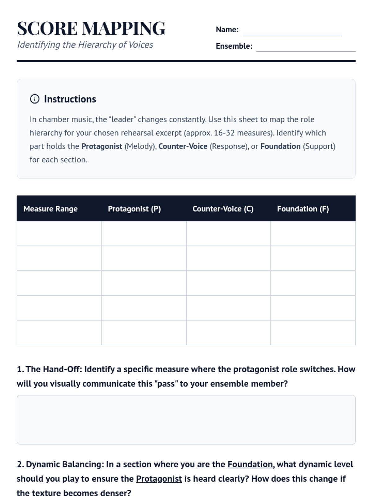 A comprehensive 12th-grade music sequence focusing on the collaborative dynamics of chamber music without a conductor. Students explore role hierarchy, non-verbal communication, acoustic tuning, and democratic interpretation to create unified ensemble performances.