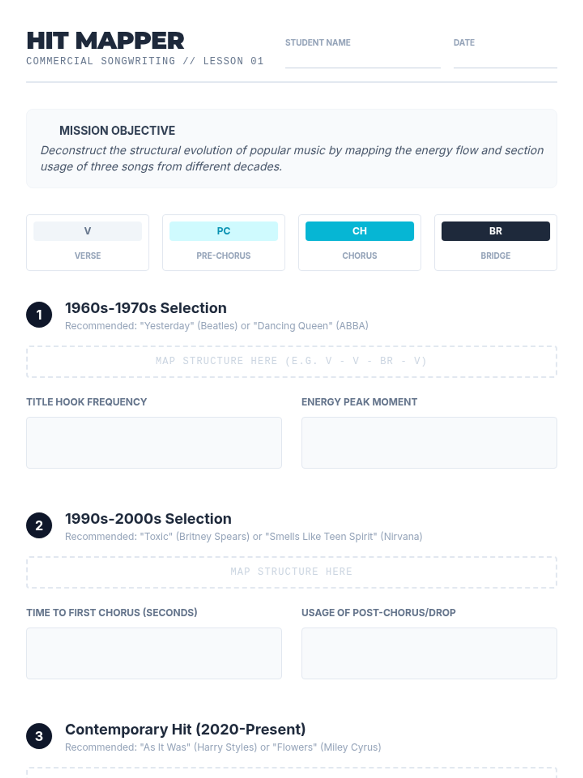 This sequence explores the mechanics of commercial songwriting, focusing on the structural patterns and lyrical techniques used in hit music. Students will move from analyzing song forms and prosody to crafting original hooks and bridges, culminating in a professional-style peer critique.