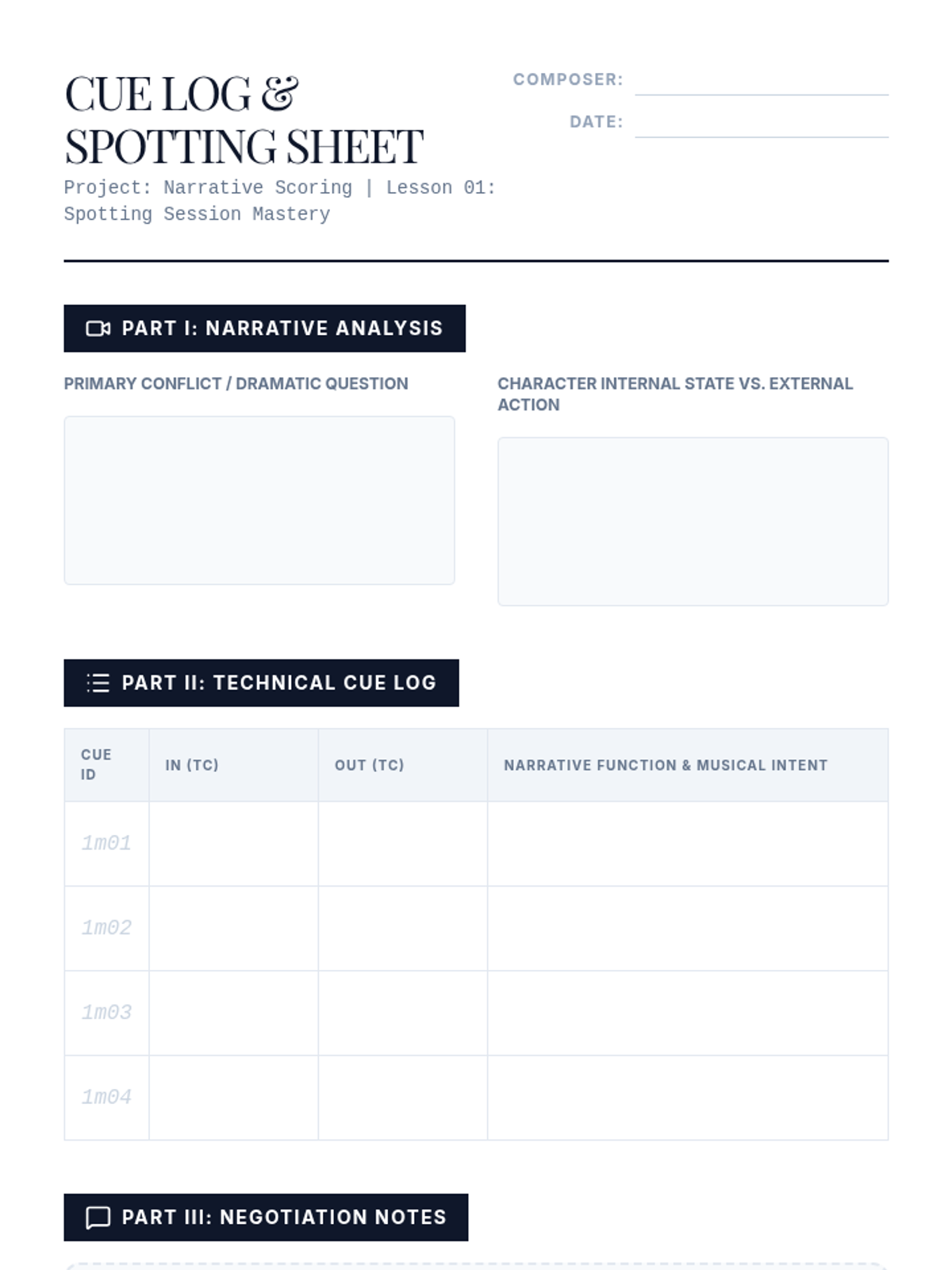 A graduate-level exploration of narrative film scoring, focusing on dramatic analysis, thematic development, psychological subtext, and technical synchronization. Students move from the conceptual spotting session to a fully synchronized final rescore project.
