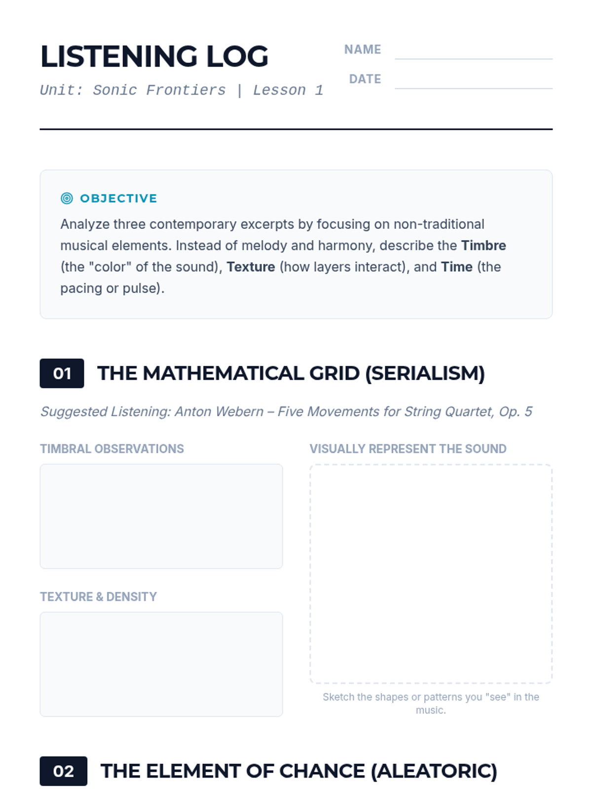 A deep dive into 20th and 21st-century avant-garde composition, exploring atonality, chance music, timbral exploration, and graphic notation for undergraduate music students.