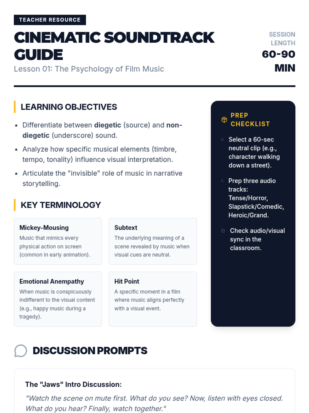A comprehensive 12th-grade sequence exploring the art and technique of scoring music for visual media. Students learn about the psychology of soundtracks, leitmotif development, technical synchronization, and atmospheric sound design, culminating in a professional-style film scoring project.