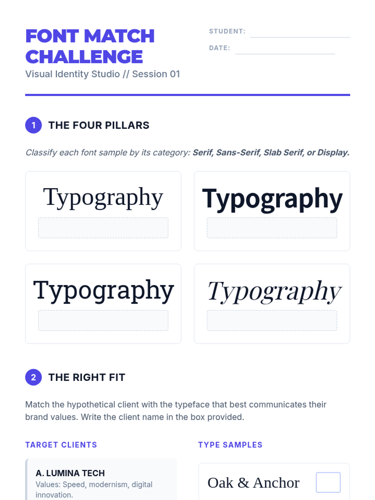 A comprehensive graphic design simulation where students act as a design agency to develop a full brand identity. They progress from analyzing logo symbolism and interpreting client briefs to digital vectorization and presenting a professional brand style guide.