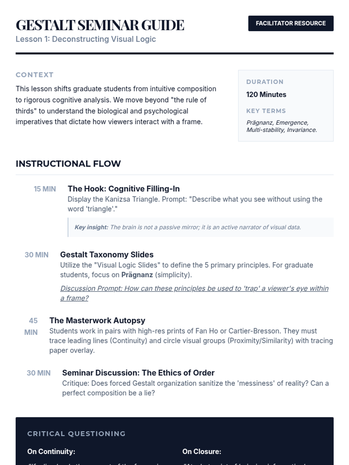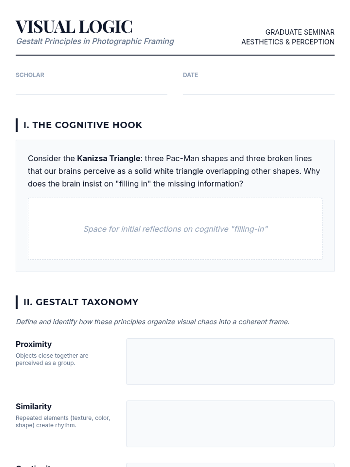 A graduate-level exploration of visual aesthetics, psychology, and semiotics in photography, moving from classical composition to the intentional disruption of visual harmony.