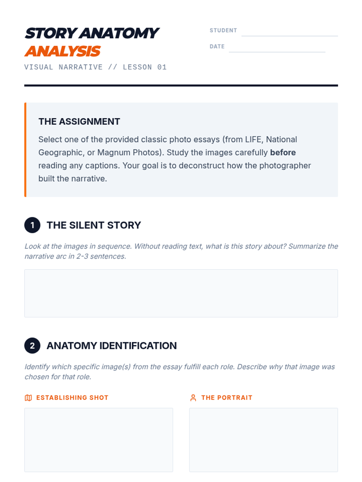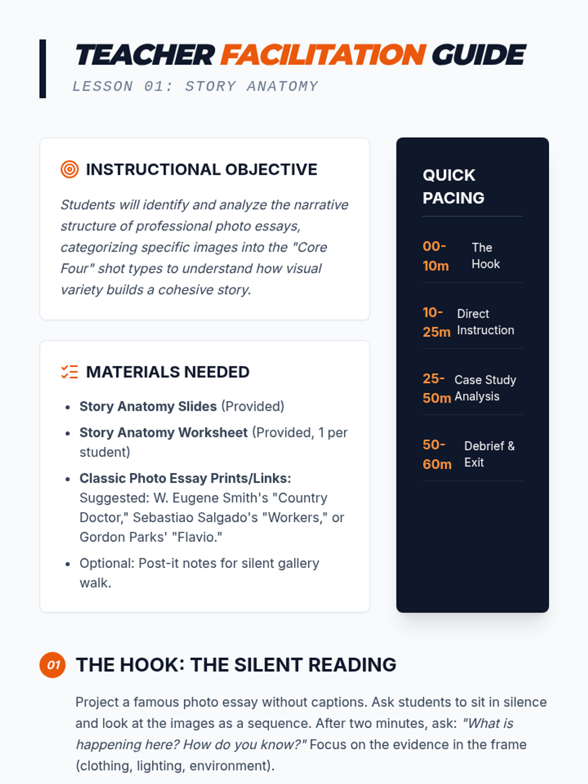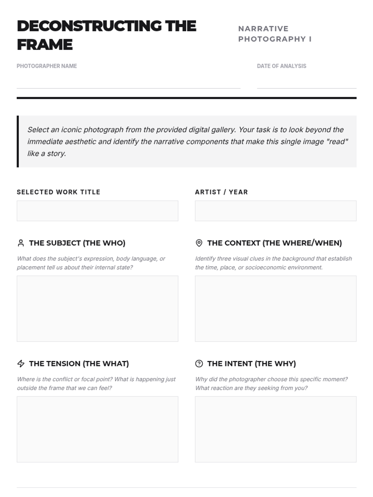 A comprehensive high school photography unit focused on visual storytelling and the creation of photo essays. Students transition from single images to intentional series, learning to storyboard, curate, and present a cohesive narrative body of work.