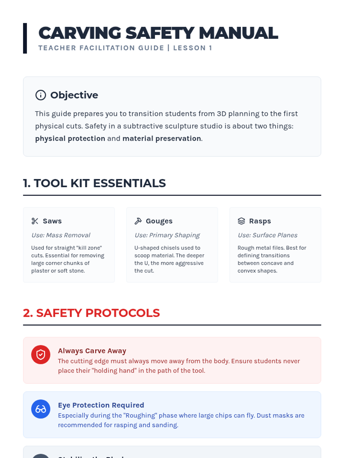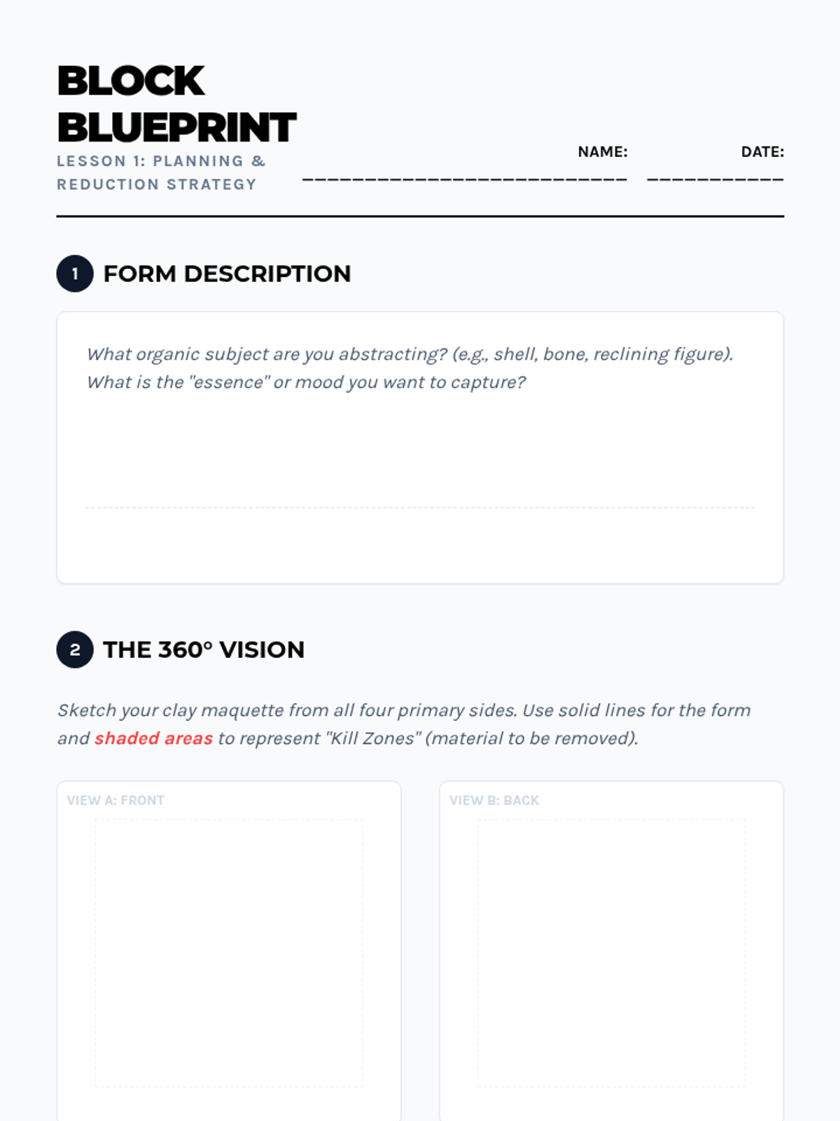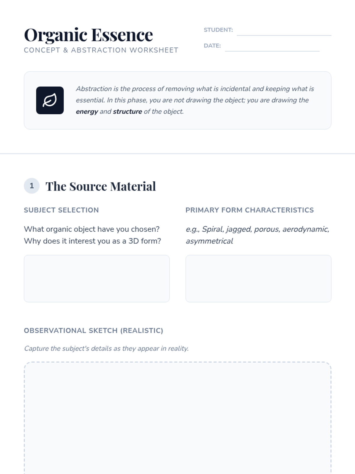 A comprehensive high school sculpture sequence focused on subtractive carving. Students progress from organic inspiration and clay maquettes to carving a final 3D form in a reductive medium, emphasizing abstraction and negative space.