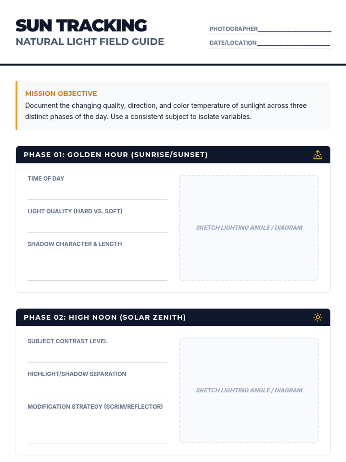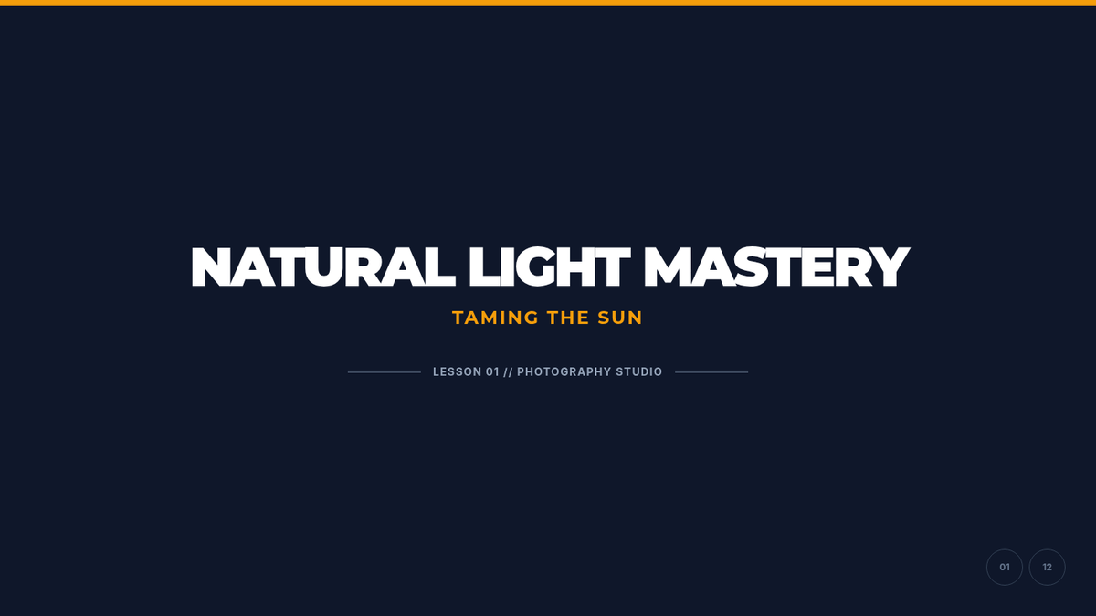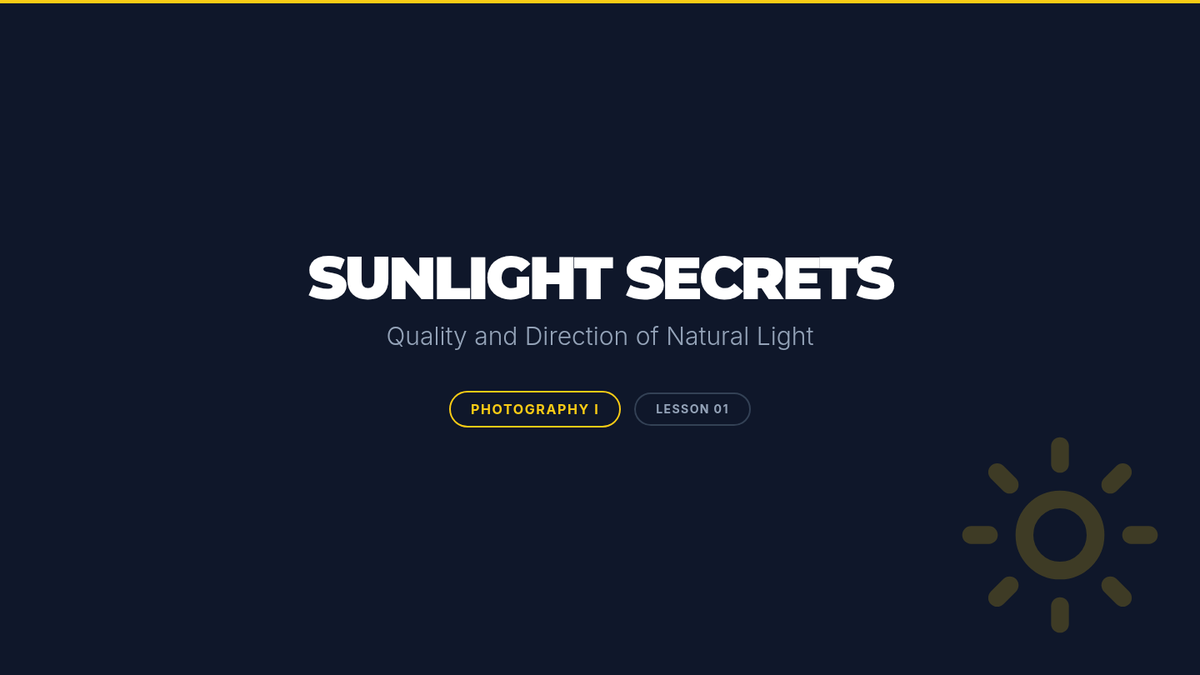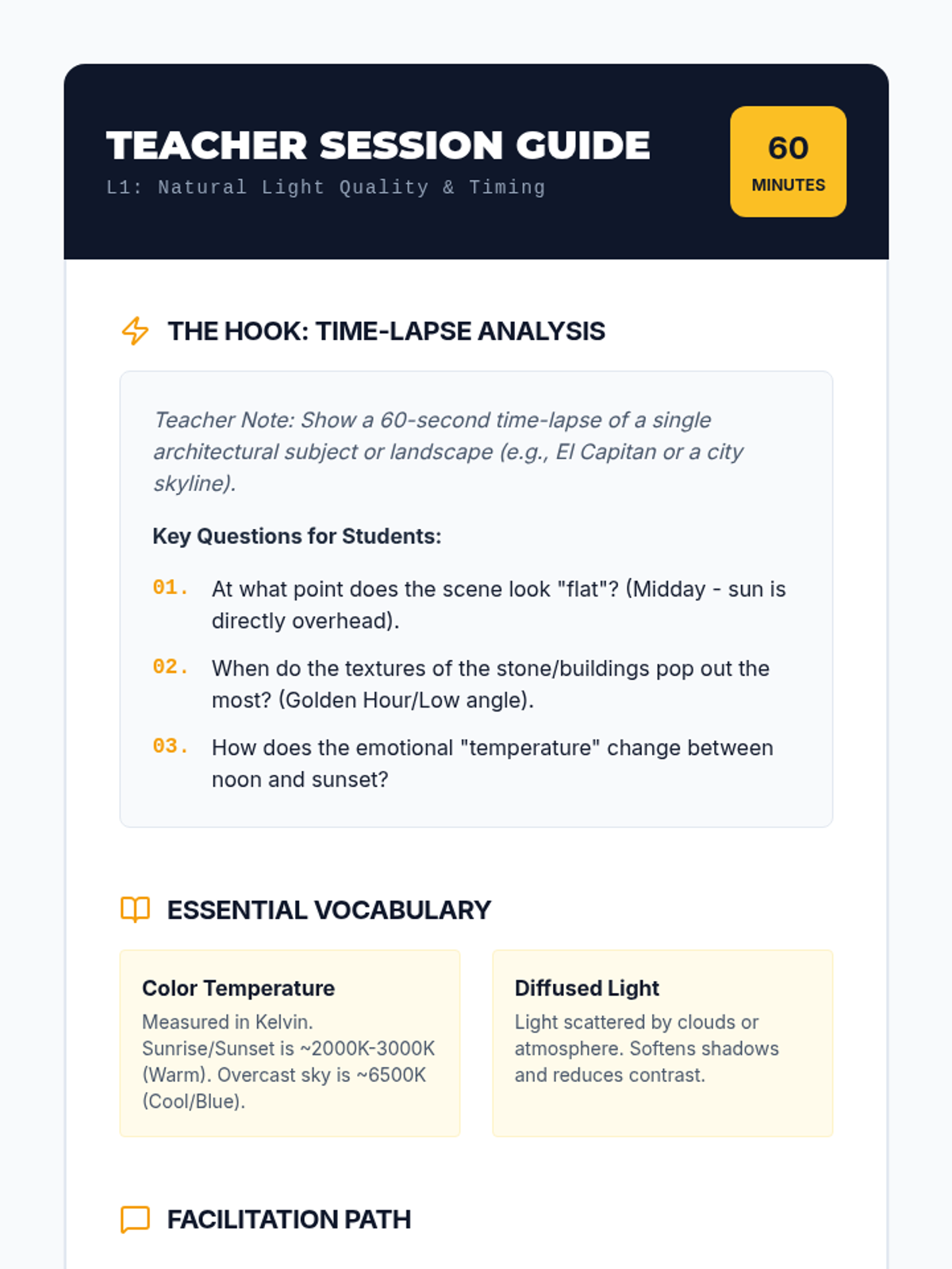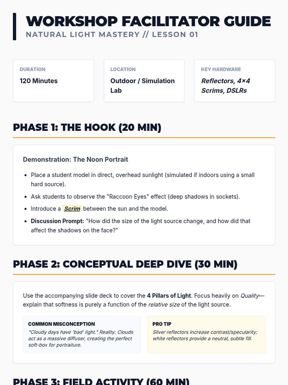 This photography sequence guides students through the physics and art of light, covering natural cycles, directional manipulation, modifiers like reflectors, and classic portrait lighting patterns.