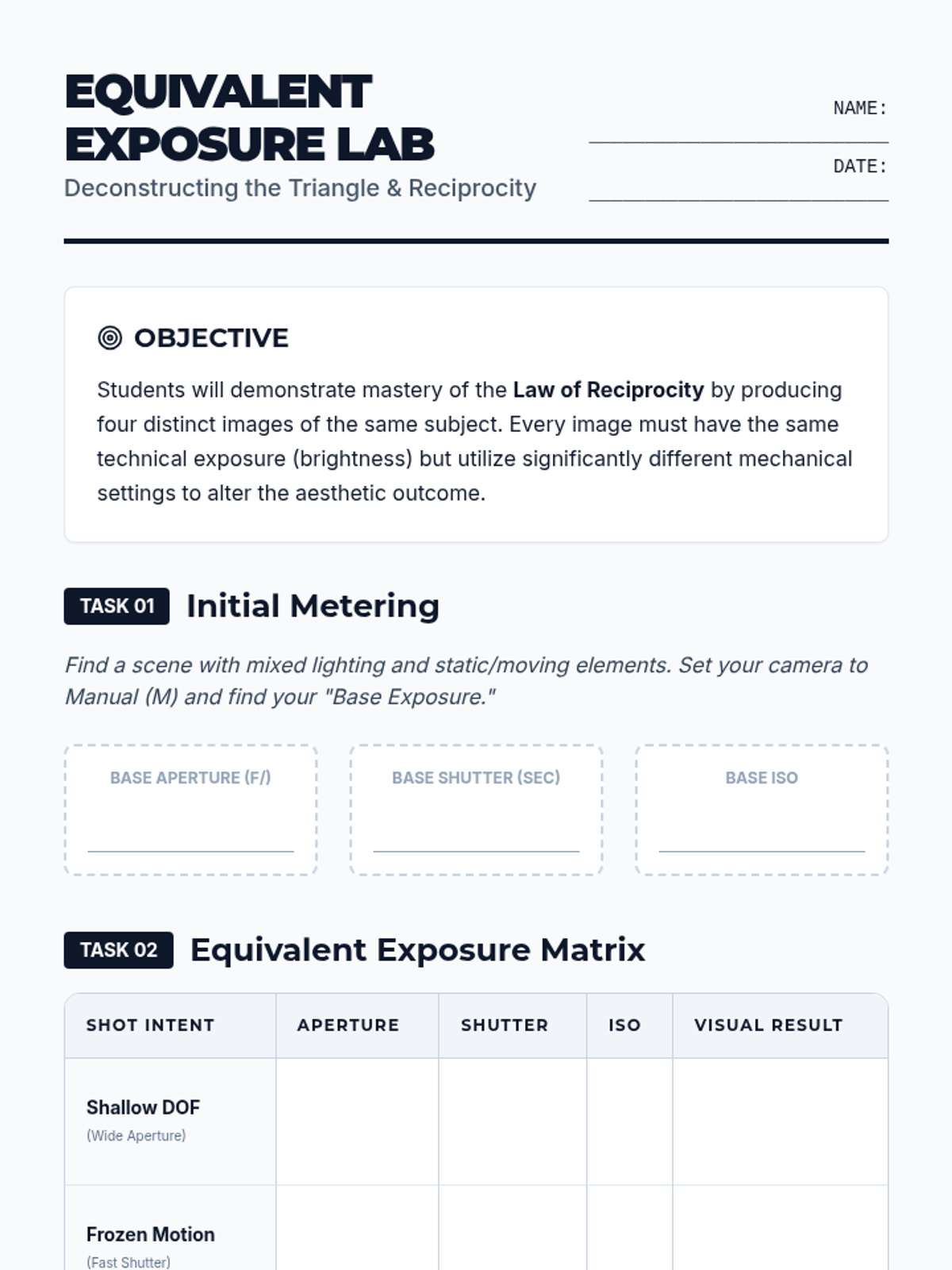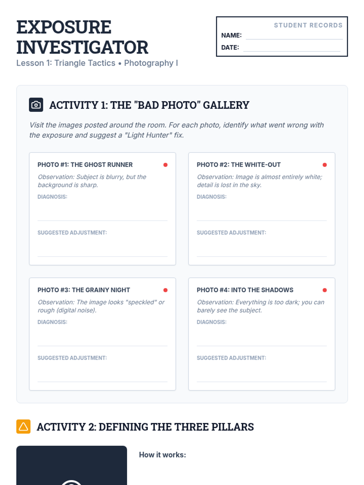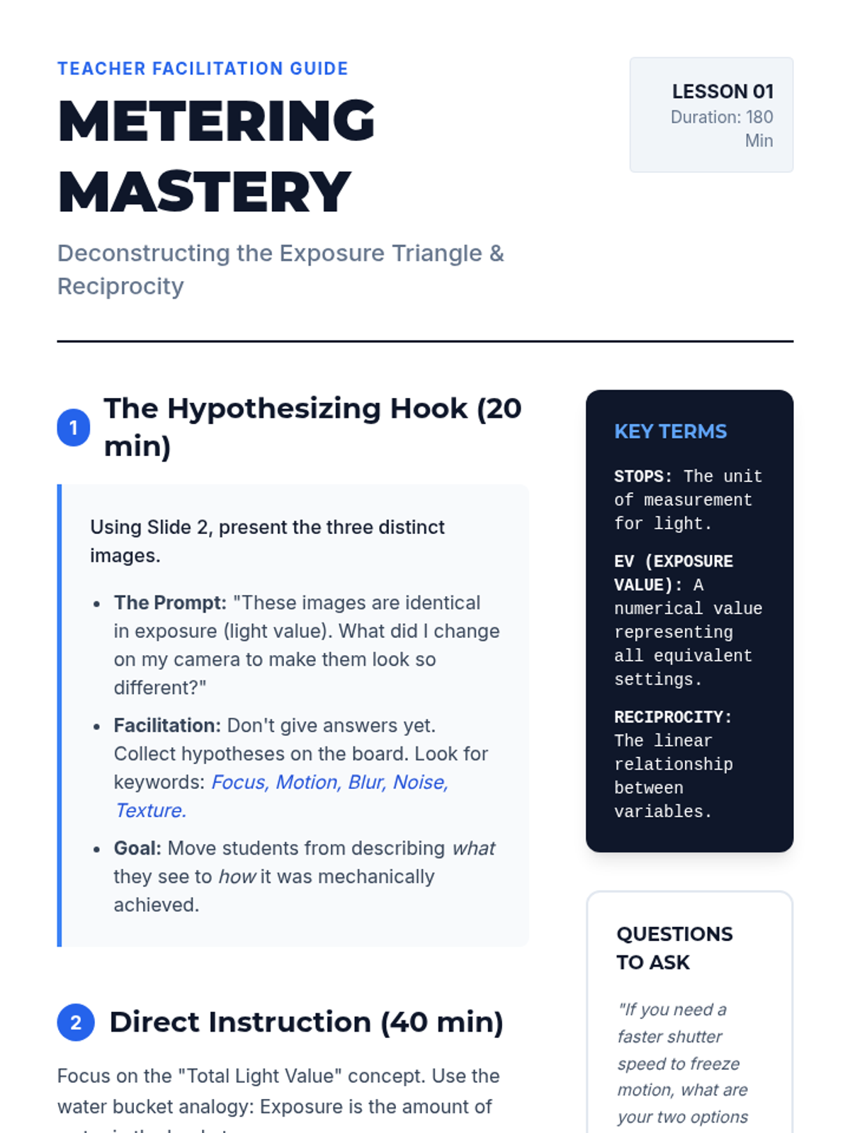 A comprehensive 9th-grade photography sequence that demystifies the Exposure Triangle: Aperture, Shutter Speed, and ISO. Students progress from diagnosing exposure errors to mastering manual control through hands-on experiments and artistic challenges.