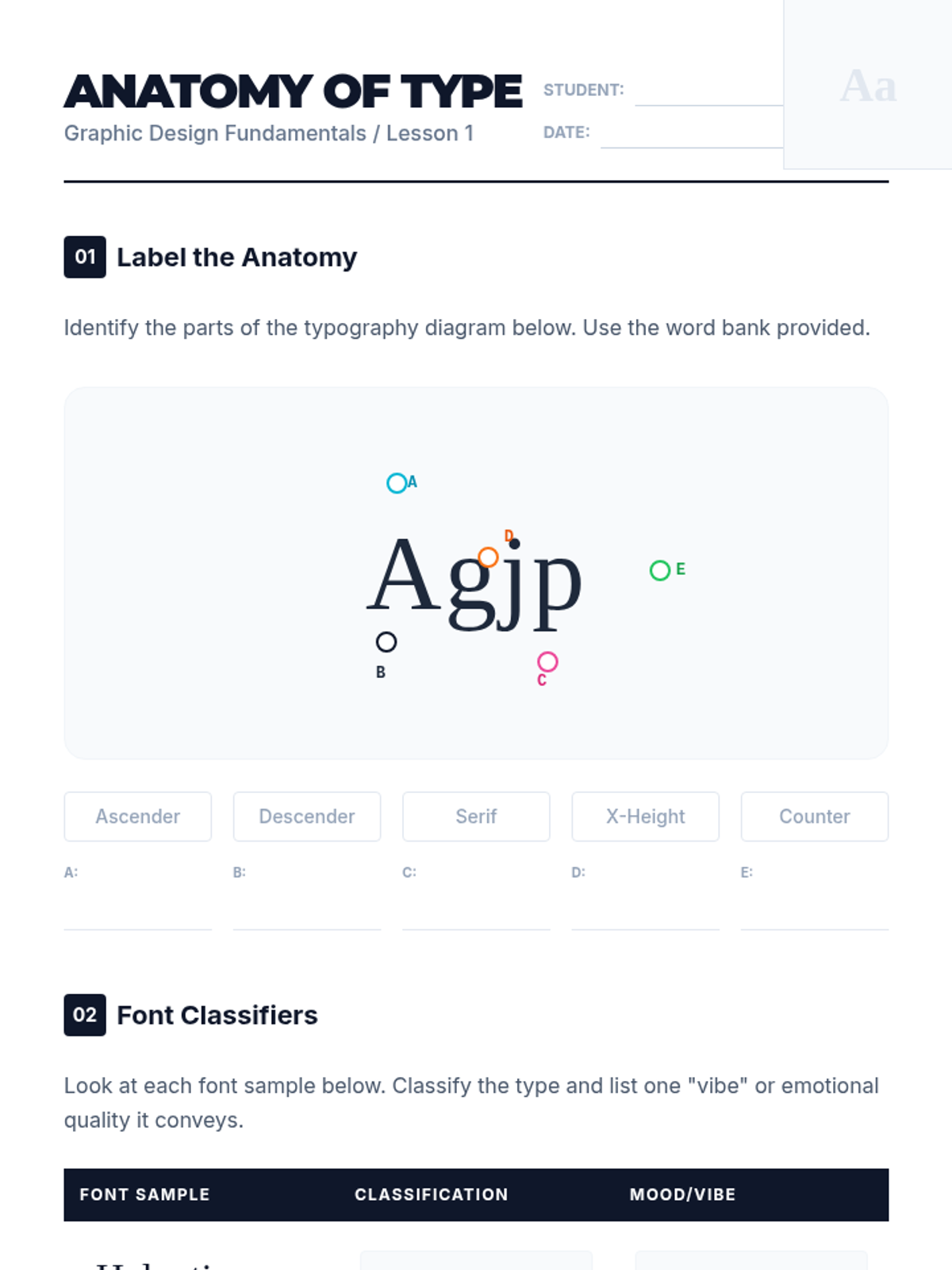 A comprehensive introduction to the structural foundations of graphic design, focusing on typography and layout. Students progress from learning the anatomy of letters to mastering complex visual hierarchies and grid systems.