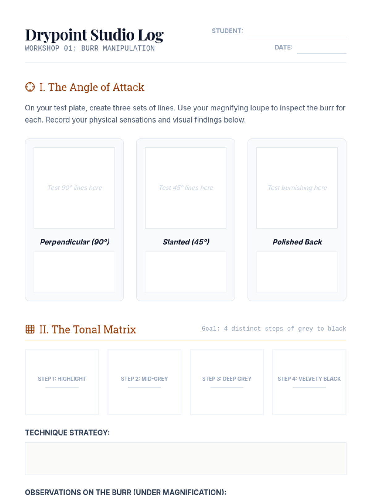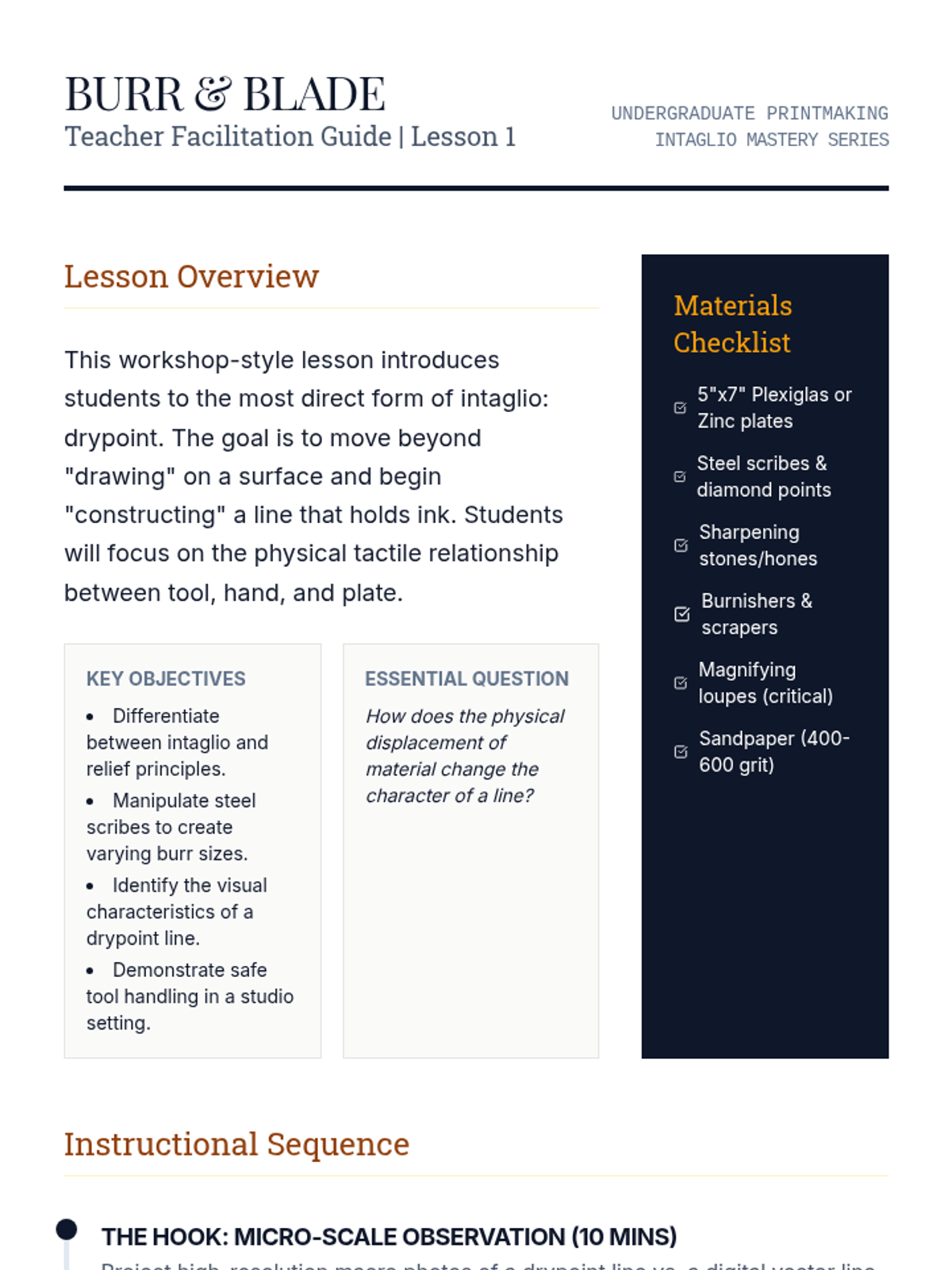 A comprehensive 11th-grade unit on the mechanics of intaglio printmaking, focusing on drypoint techniques, plate preparation, the chemistry of wiping, and chine-coll\u00e9 integration. Students master the relationship between physical pressure and visual atmosphere.