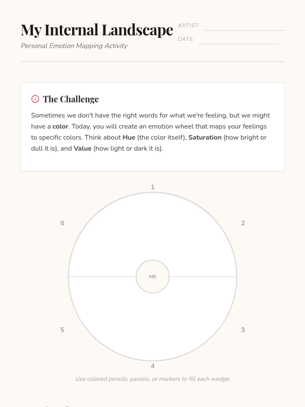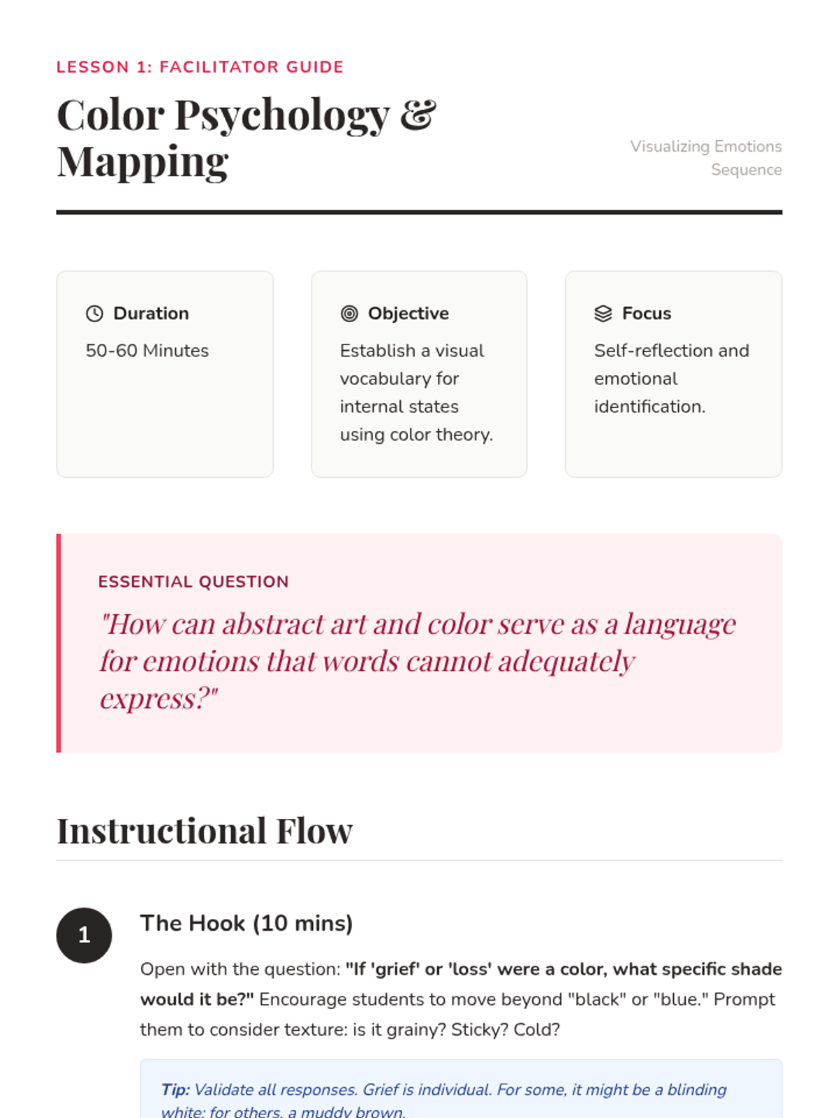 This sequence guides students through using visual arts as a non-verbal language for processing complex emotions associated with loss, focusing on abstract expressionism and color theory.