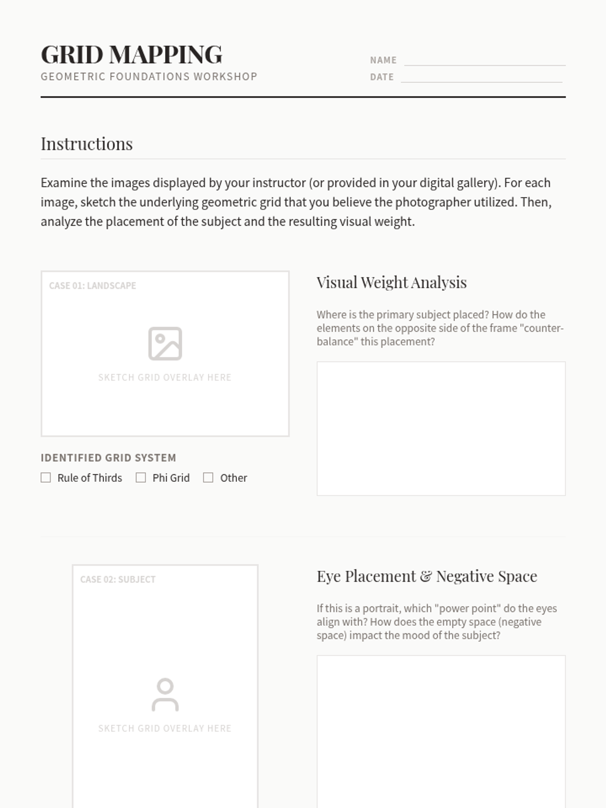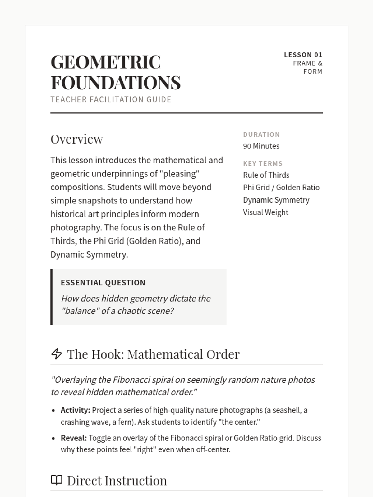 A comprehensive exploration of visual language in photography, moving from classical geometric principles to intentional rule-breaking. Students will master the 'grammar' of the frame through analysis, field practice, and critical critique.
