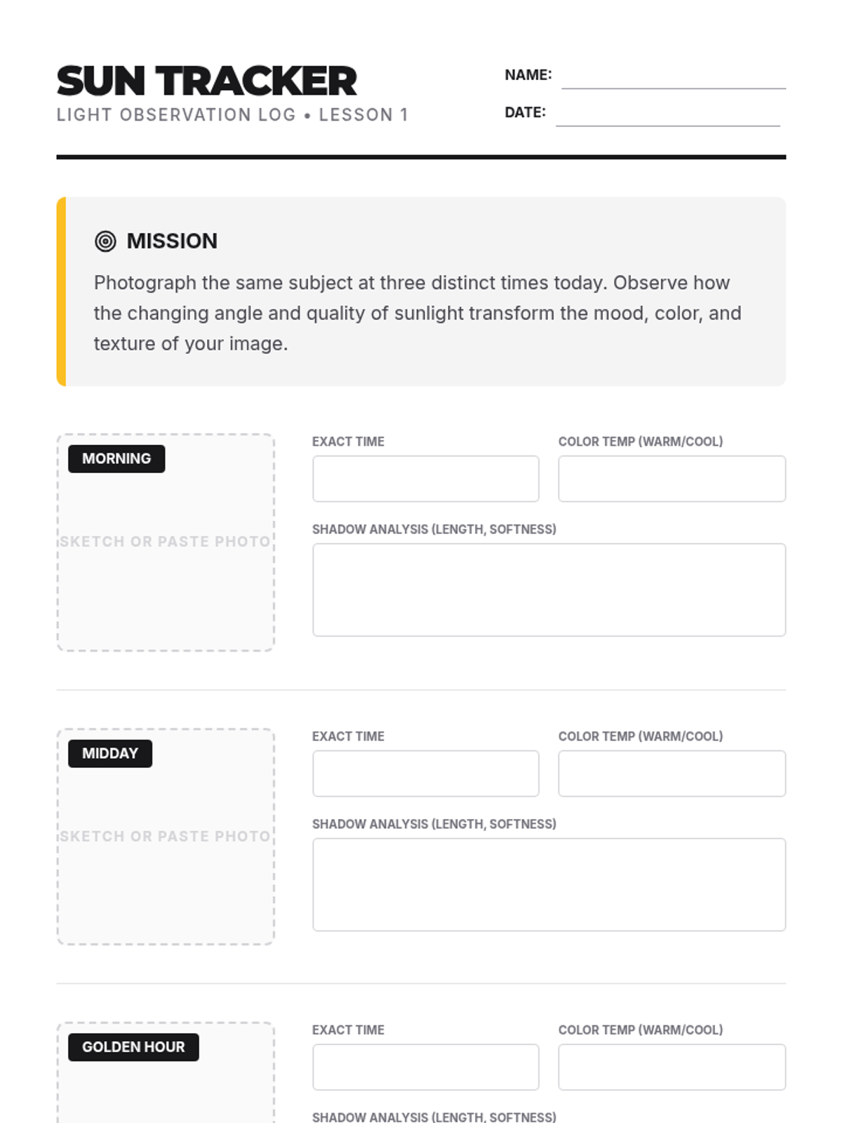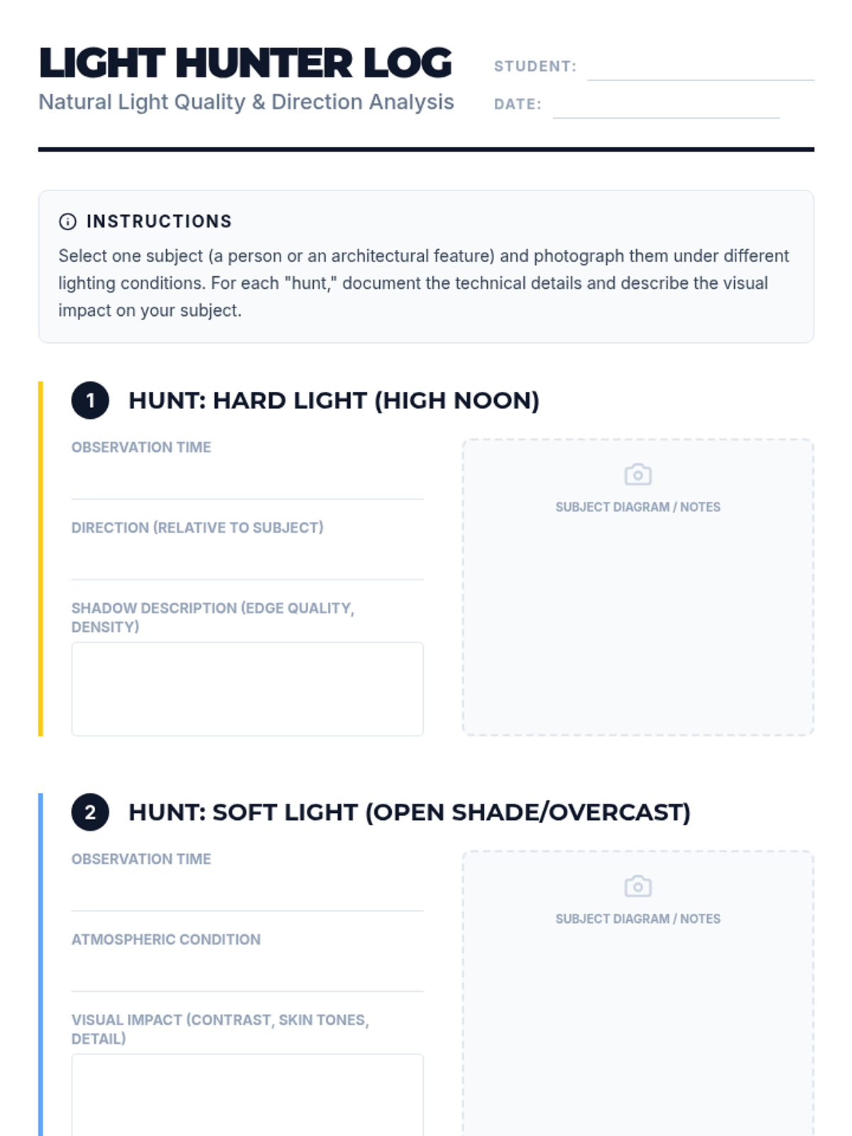 This 8th-grade photography sequence explores how the quality, direction, and color of light influence mood and dimensionality. Students progress from basic light quality to professional portrait patterns and conceptual lighting design.