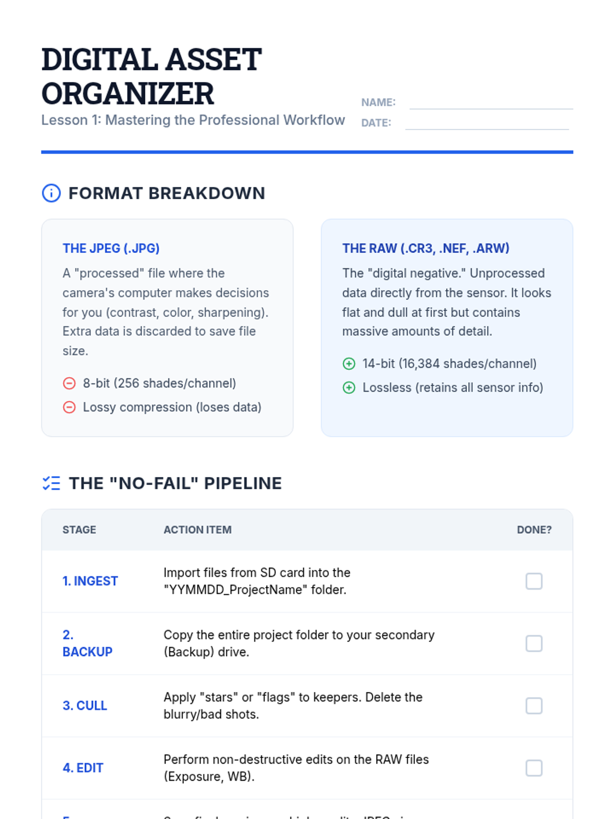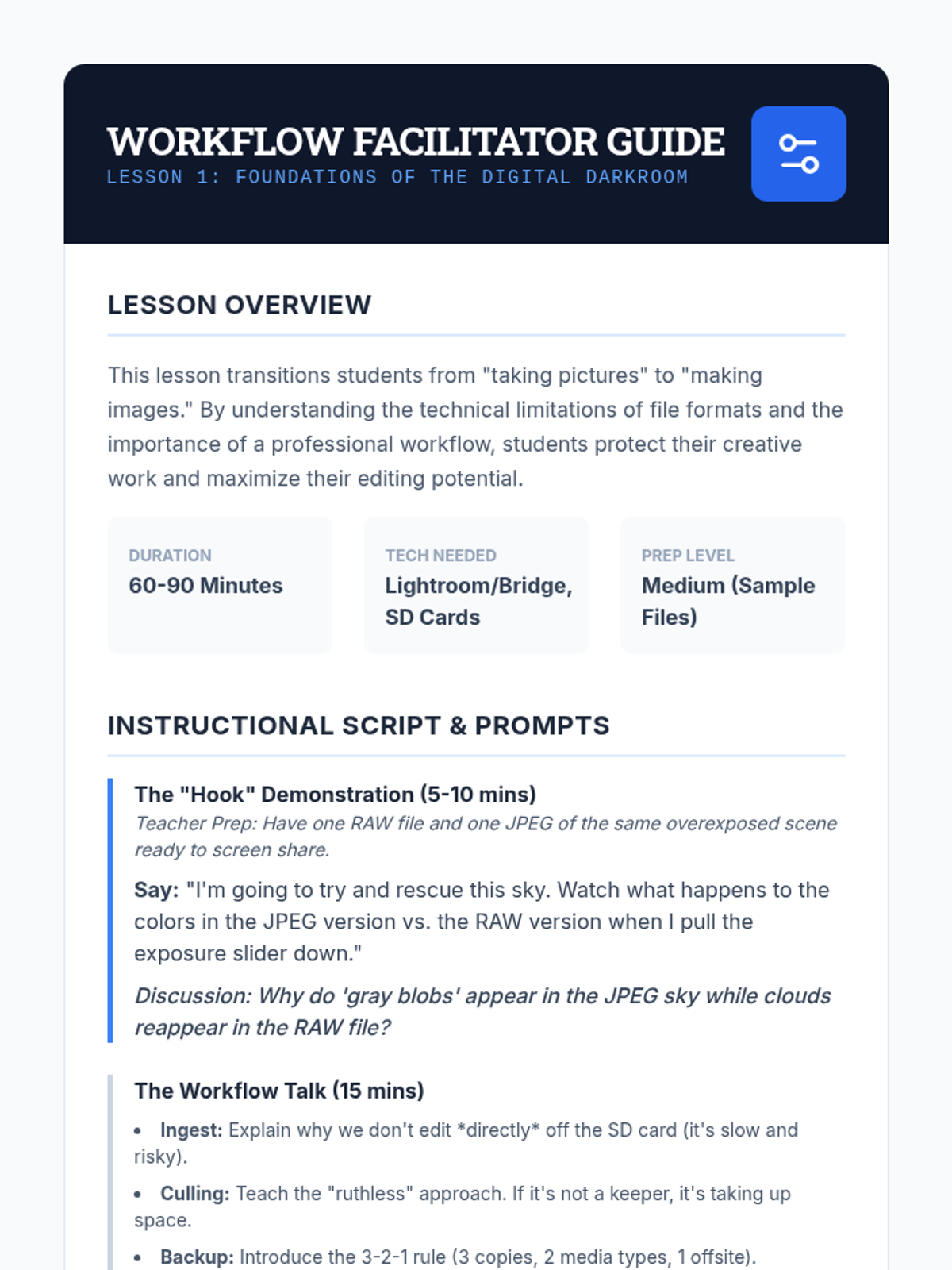 A comprehensive 12th-grade photography sequence focusing on professional digital workflow, non-destructive editing, and the ethics of post-processing. Students progress from basic organization to advanced color grading and retouching while debating the boundaries of photographic truth.