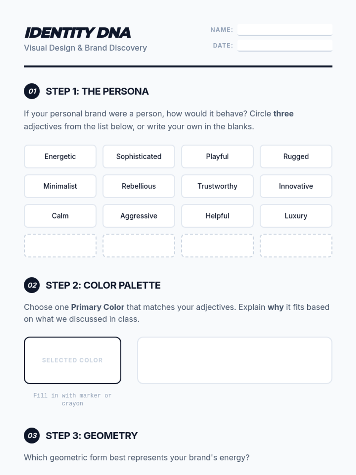 This graduate-level sequence explores the strategic intersection of visual design and brand identity, moving from surface-level aesthetics to deep strategic systems. Students learn to translate organizational values into scalable visual assets, culminating in the creation of a professional brand standards manual.