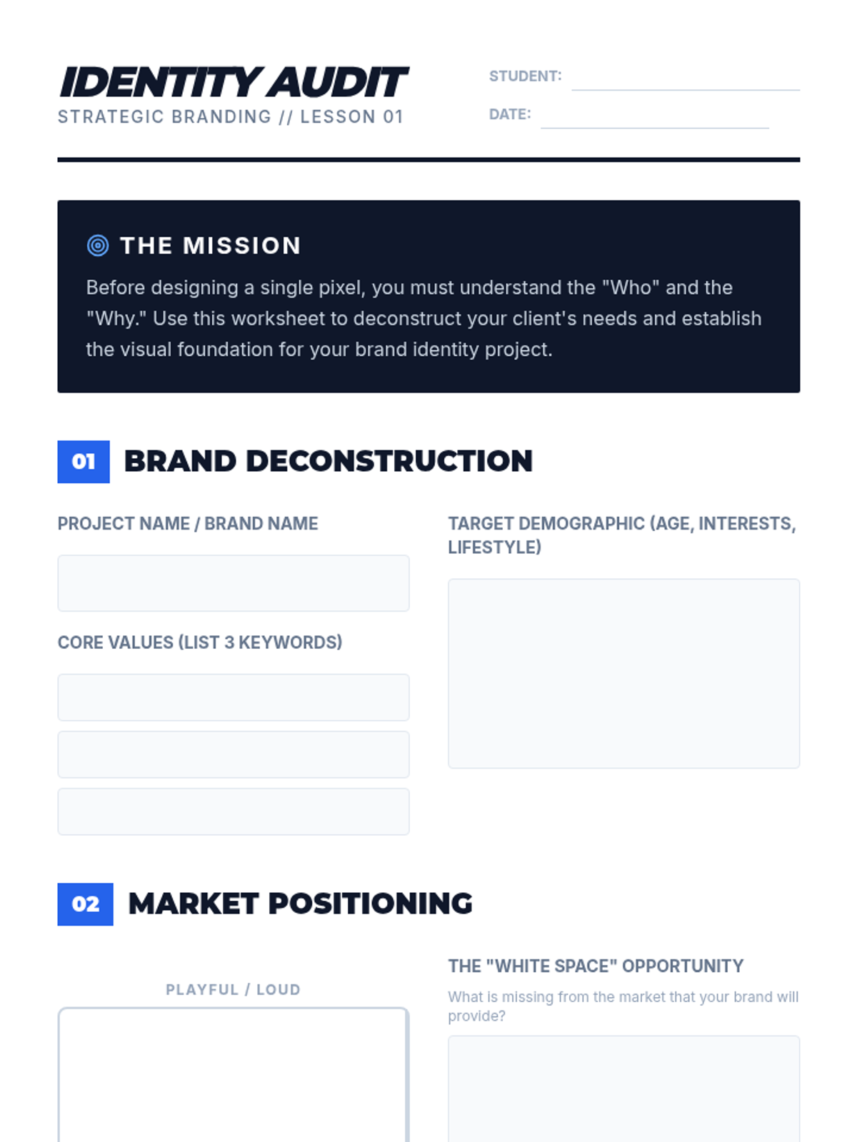 A comprehensive project-based sequence where students act as creative directors to develop a full brand identity system. From client analysis and sketching to vectorization and style guide creation, students master the professional design workflow.