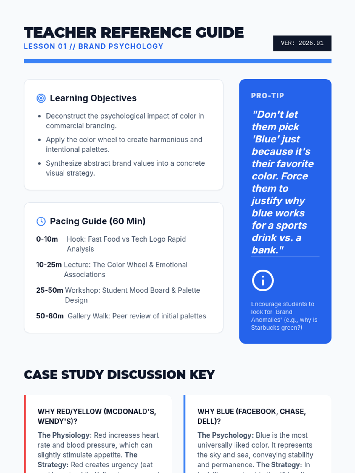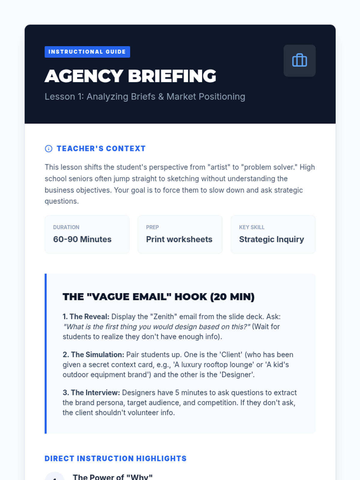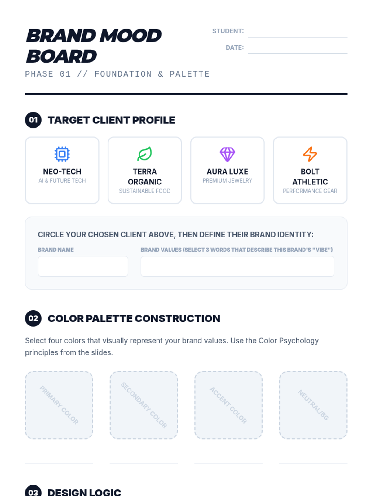 A comprehensive graphic design sequence where 11th-grade students simulate a professional branding agency environment, moving from strategic analysis to a full brand style guide.