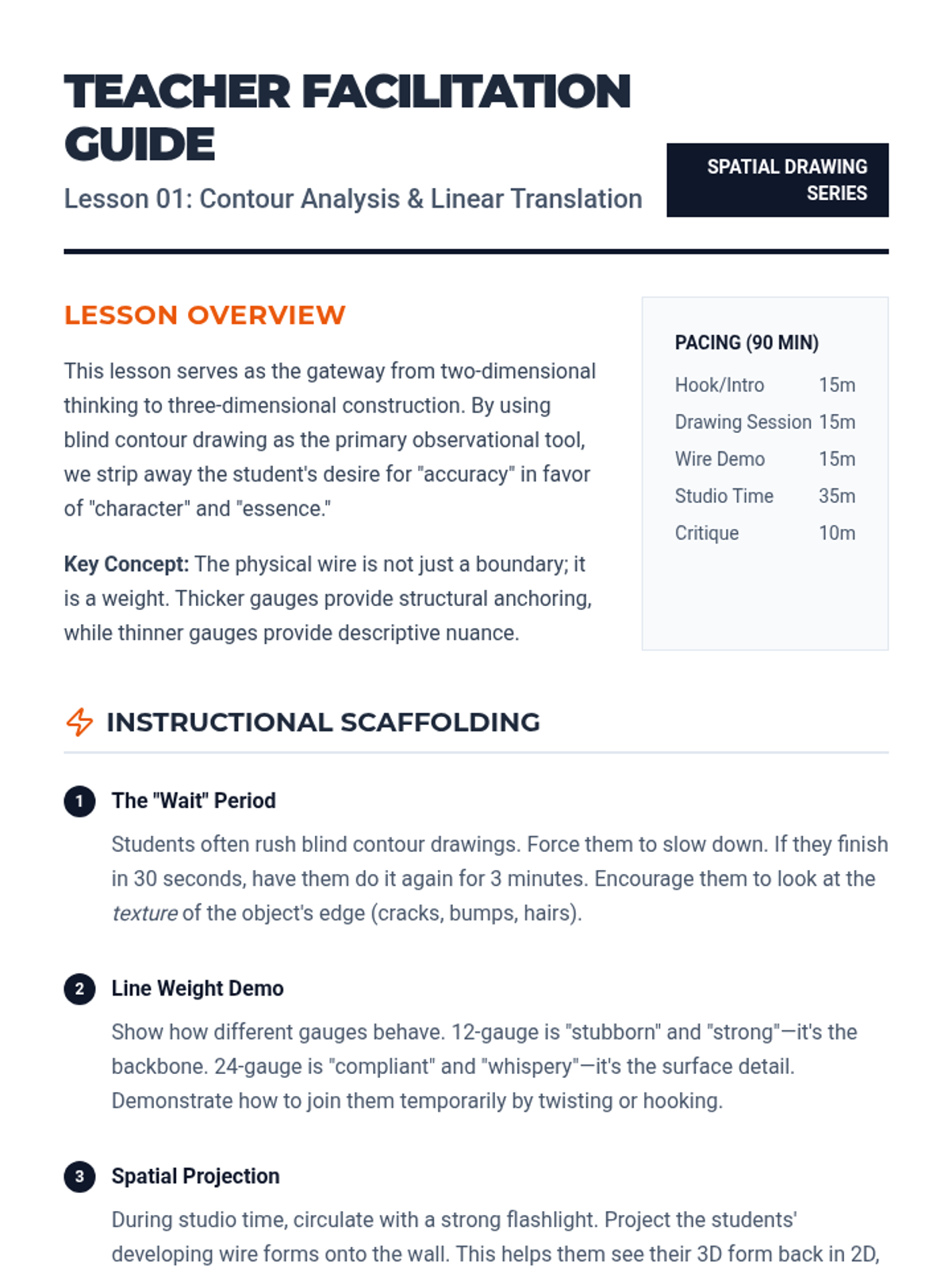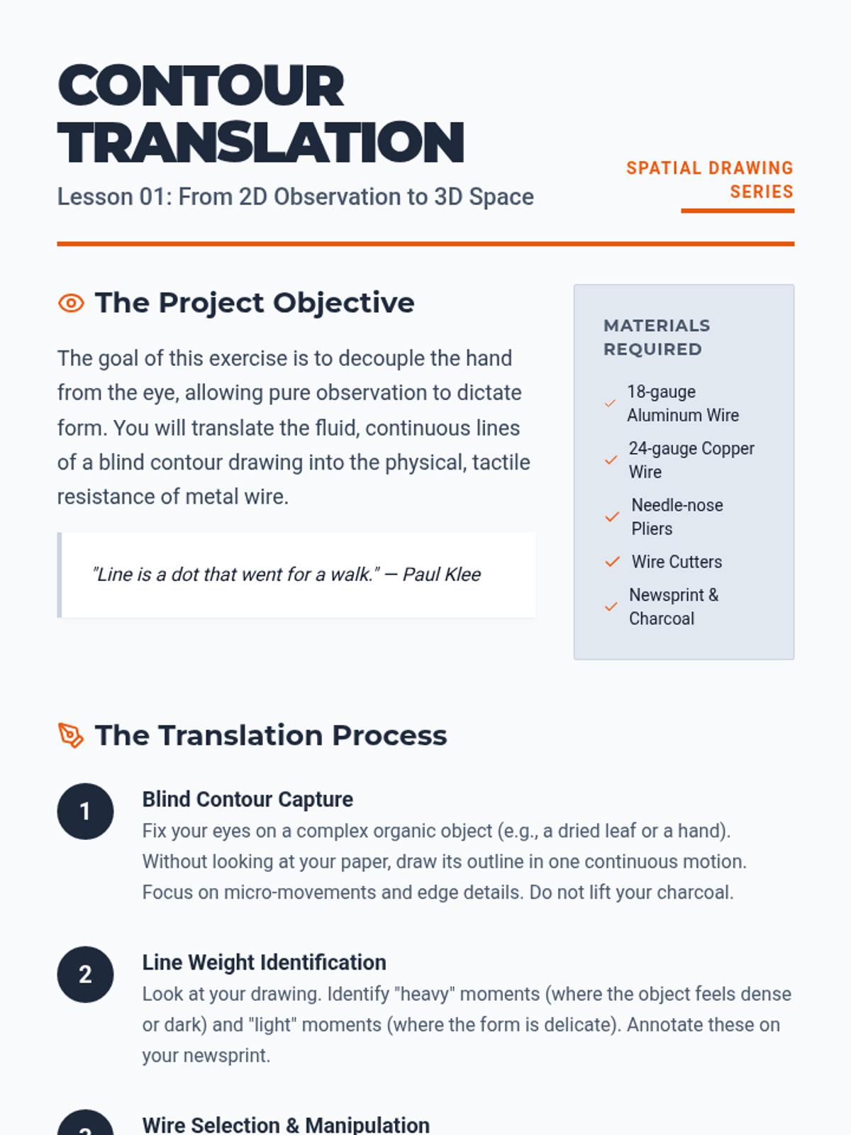 This sequence explores linear media (wire, rod, and tubing) to create 'drawings in space' that define volume without mass. Students learn to translate 2D contour drawings into 3D forms using cold-connection techniques, investigating implied volume, tension, and the interplay between light and shadow.