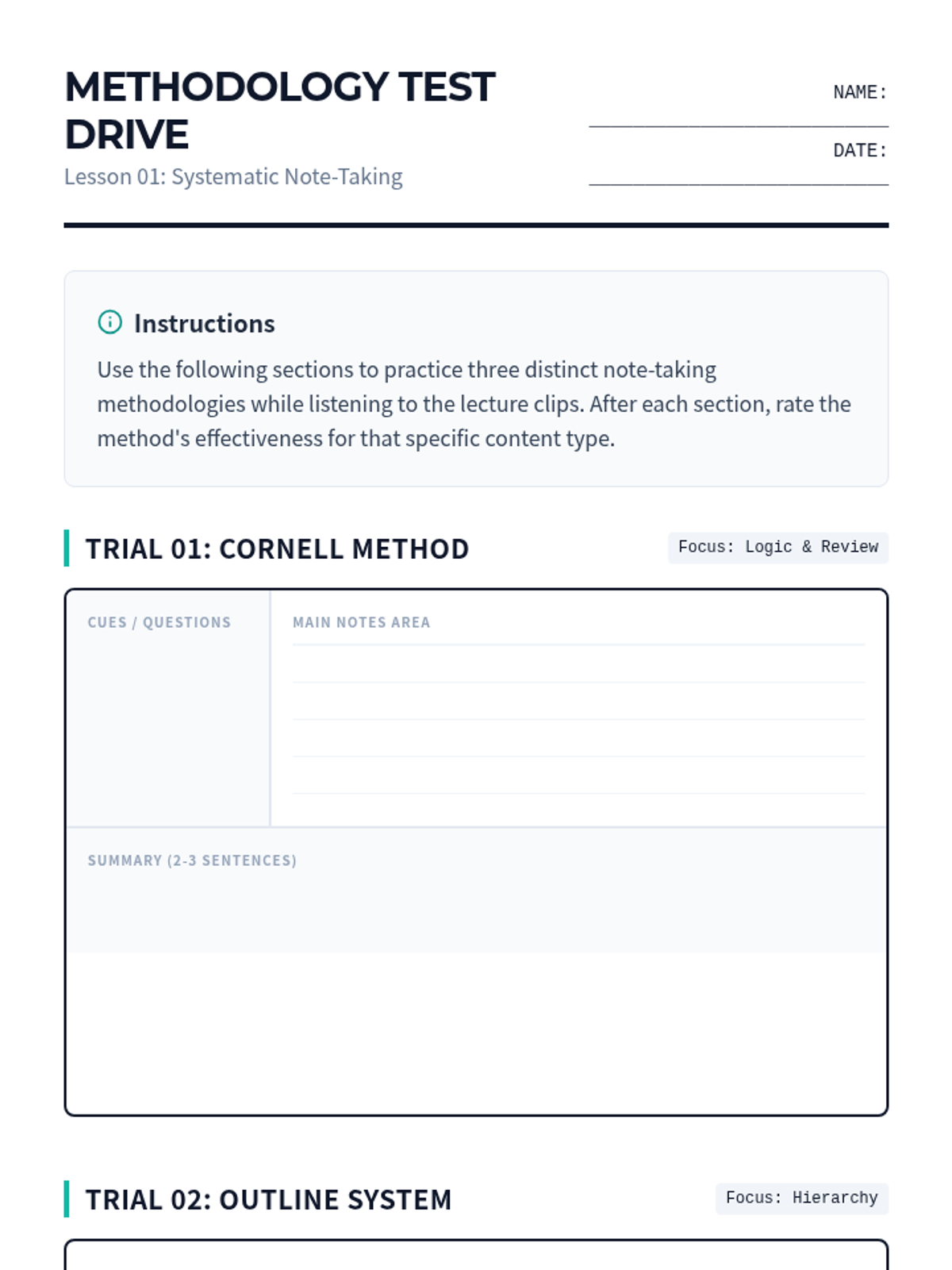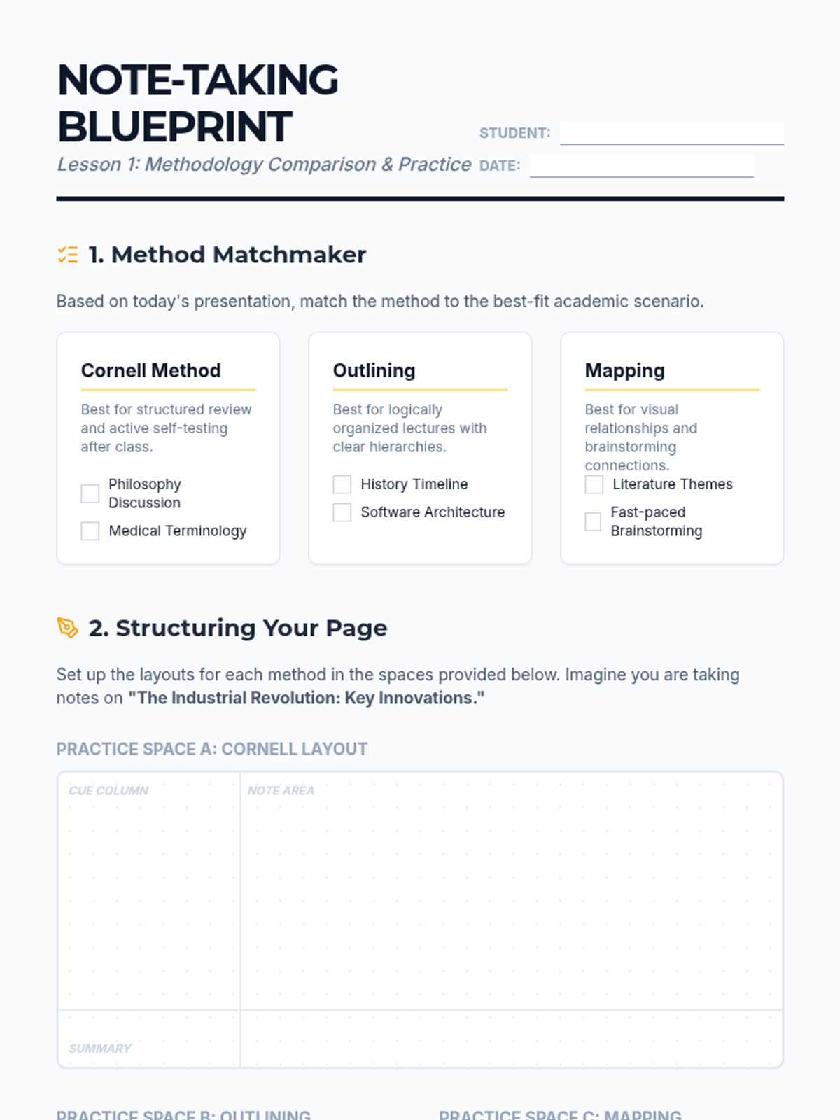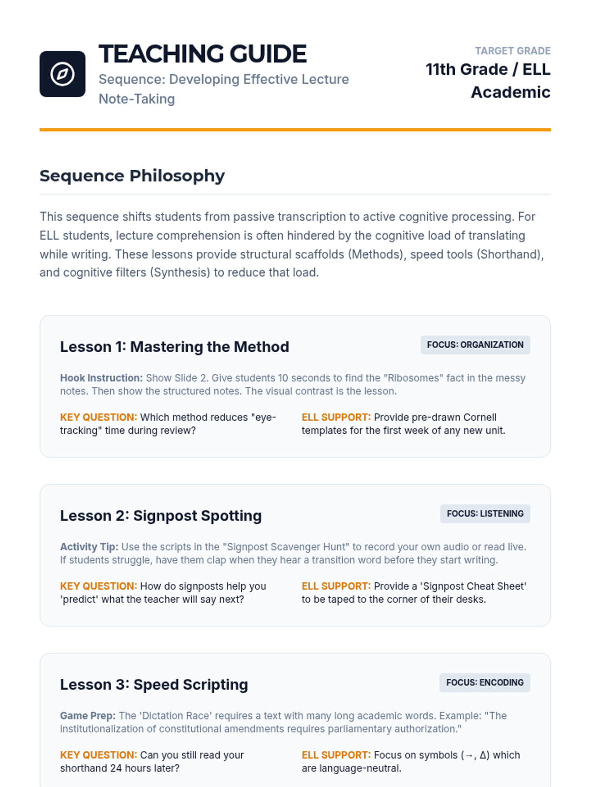 This sequence equips 11th-grade students with advanced academic note-taking systems like Cornell, Outlining, and Mapping. It focuses on active listening for verbal signposts, developing personalized shorthand, and synthesizing complex lecture content to prepare for university-level academic success.