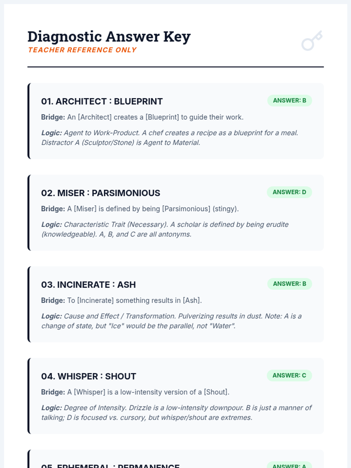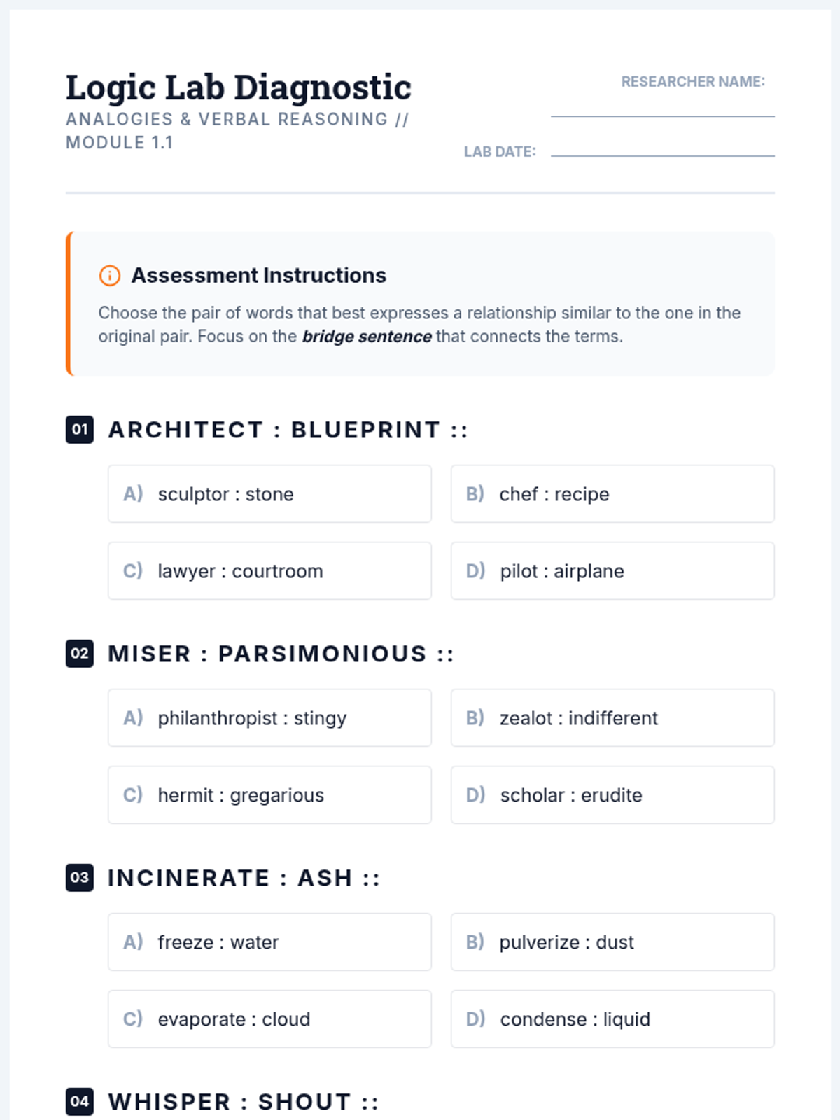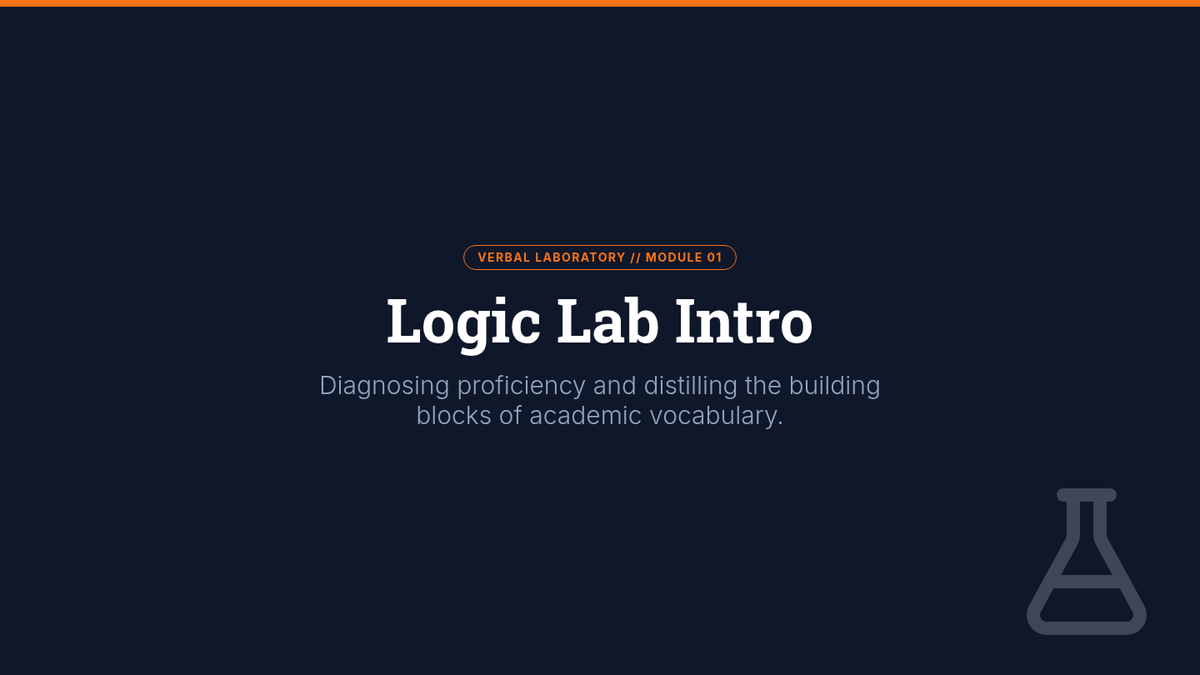 A high-school level sequence focusing on the logic and precision required for advanced analogy problems, preparing students for standardized testing and academic vocabulary mastery through a 'Verbal Laboratory' theme.