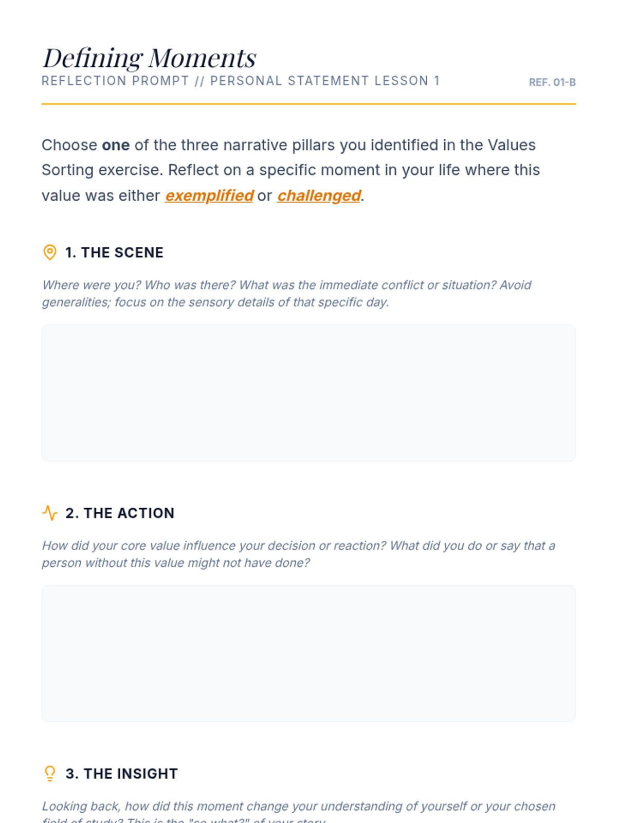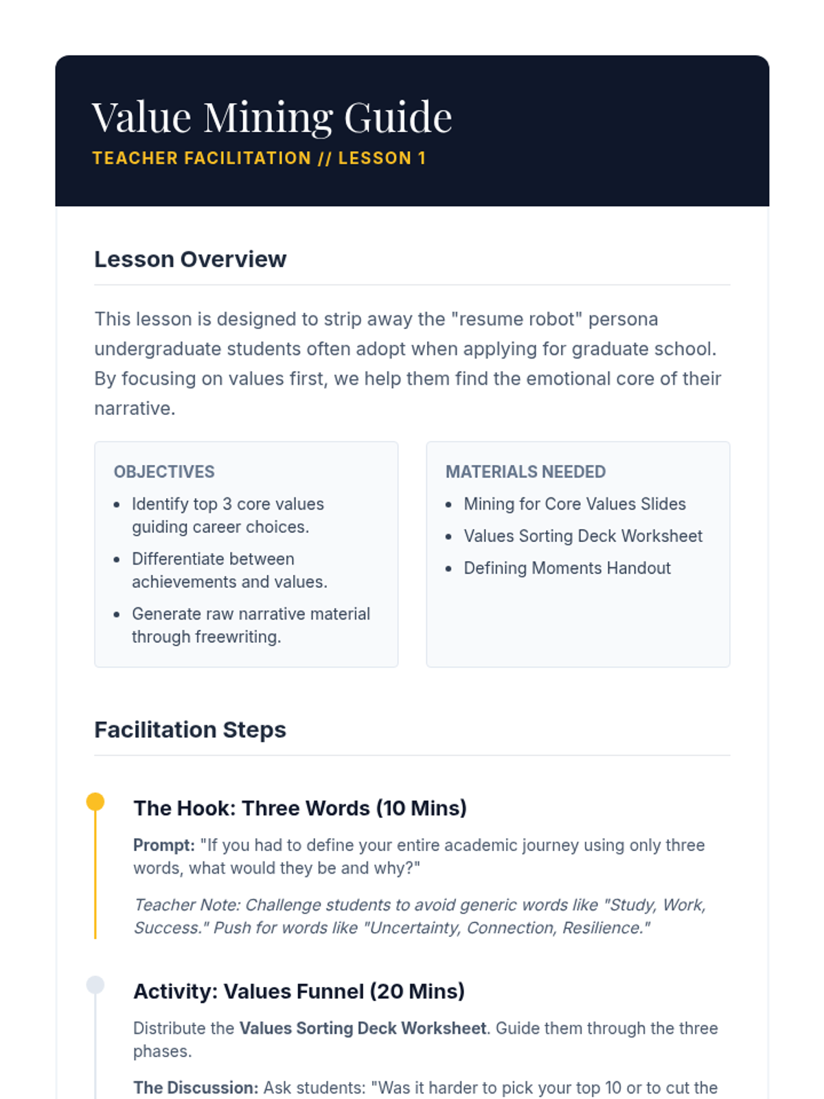 A 5-lesson sequence for graduate students to identify and articulate their professional and academic identity for personal statement writing. The sequence covers value identification, intellectual mapping, narrative construction, reframing challenges, and synthesizing a personal thesis.
