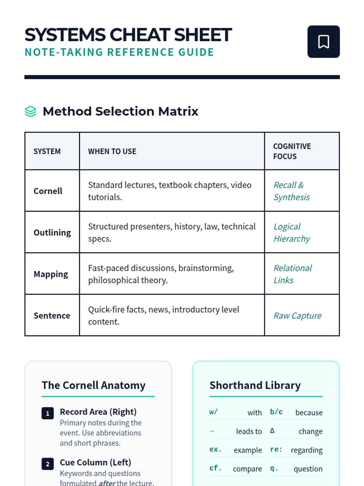 A comprehensive sequence for undergraduate students focusing on using graphic organizers to support working memory during fast-paced lectures. Students learn to prepare skeletal notes, map STEM logic, track humanities arguments, leverage digital tools, and synthesize notes for long-term retention.
