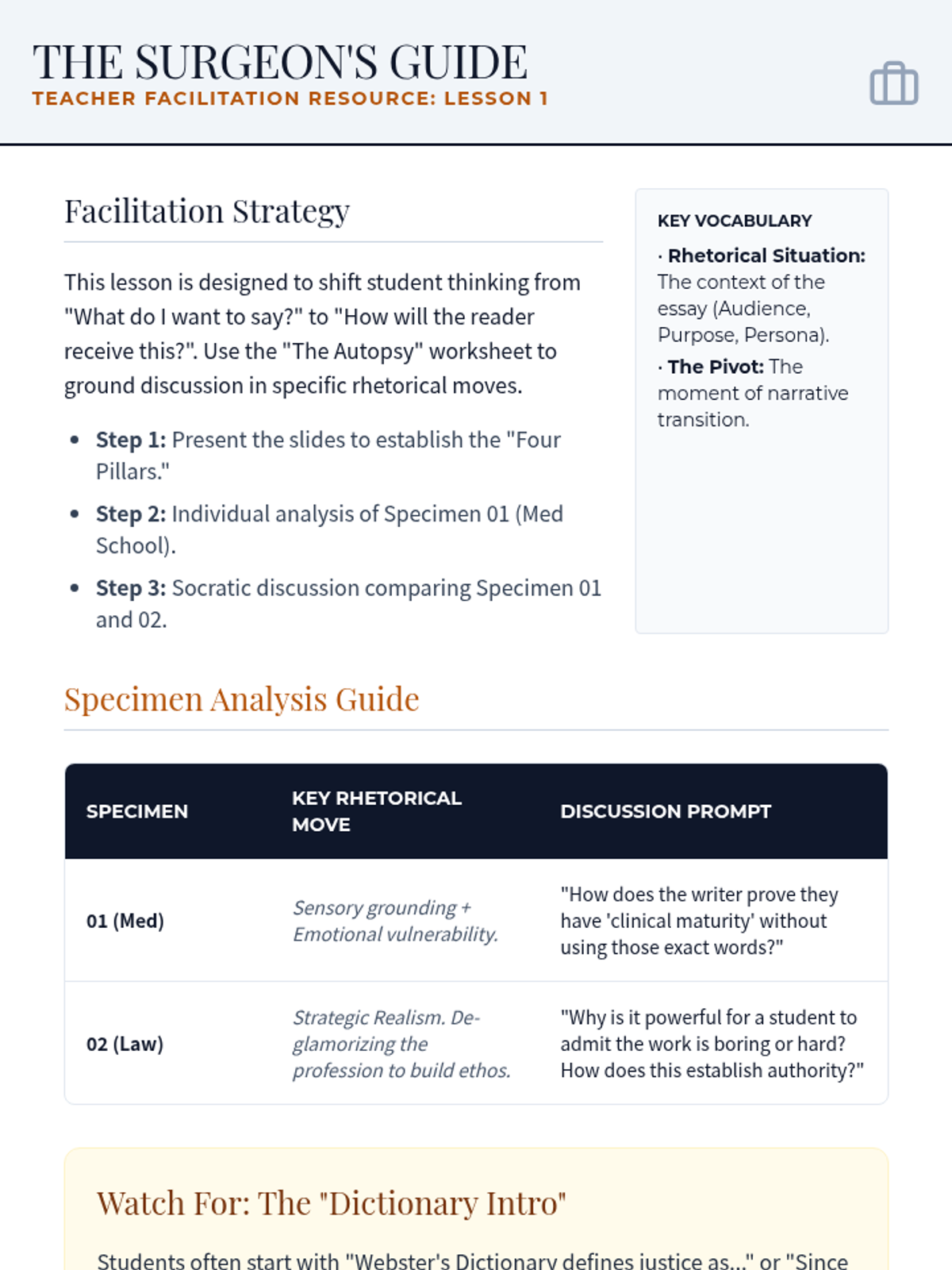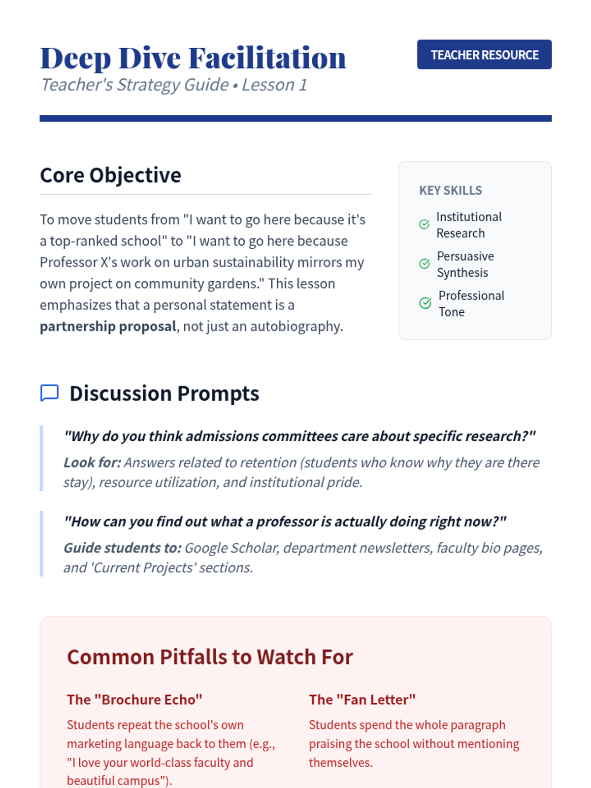 A comprehensive unit for undergraduate students to master the art of tailoring personal statements, writing supplemental essays, and organizing modular content for multiple applications. Students learn to research institutions deeply and adapt their core narratives to specific program values.