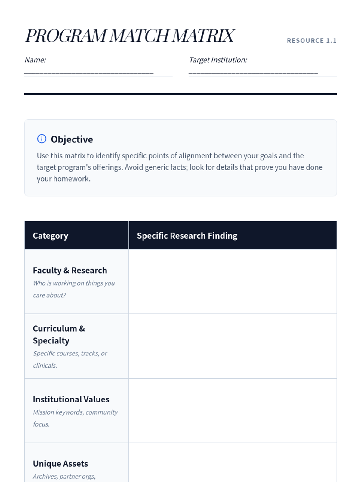 A comprehensive sequence for graduate applicants focusing on the strategic alignment of their personal statements with specific academic programs and institutions. Students move from deep research to drafting modular, high-impact 'fit' paragraphs that demonstrate institutional knowledge and faculty synergy.