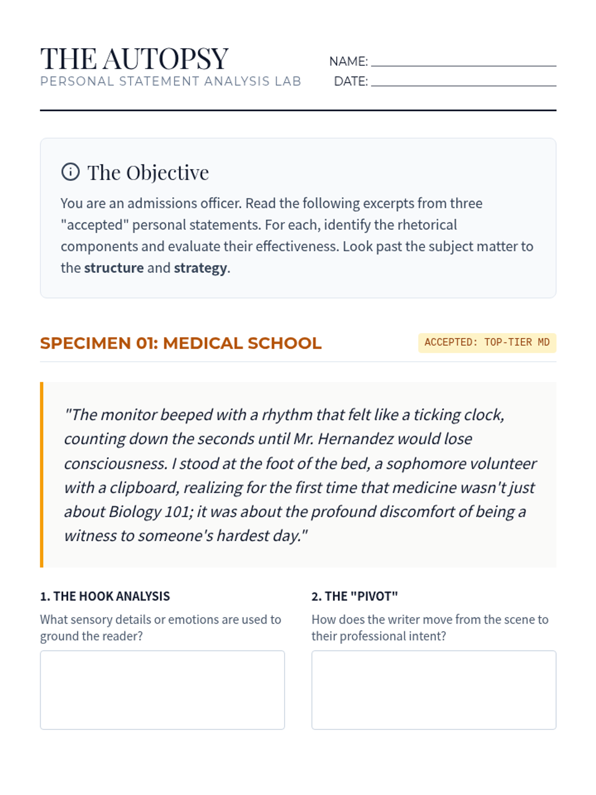 A comprehensive sequence for undergraduate students to master the rhetorical strategies of high-stakes personal statements. Students move from analyzing successful exemplars to mastering the art of descriptive storytelling, tone management, and strategic prompt alignment.