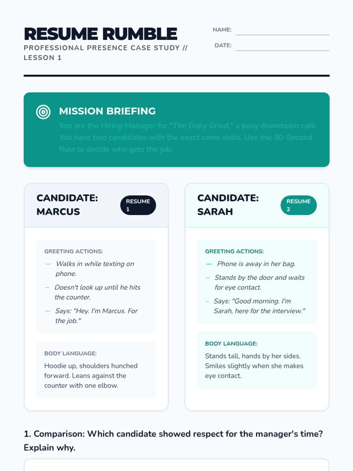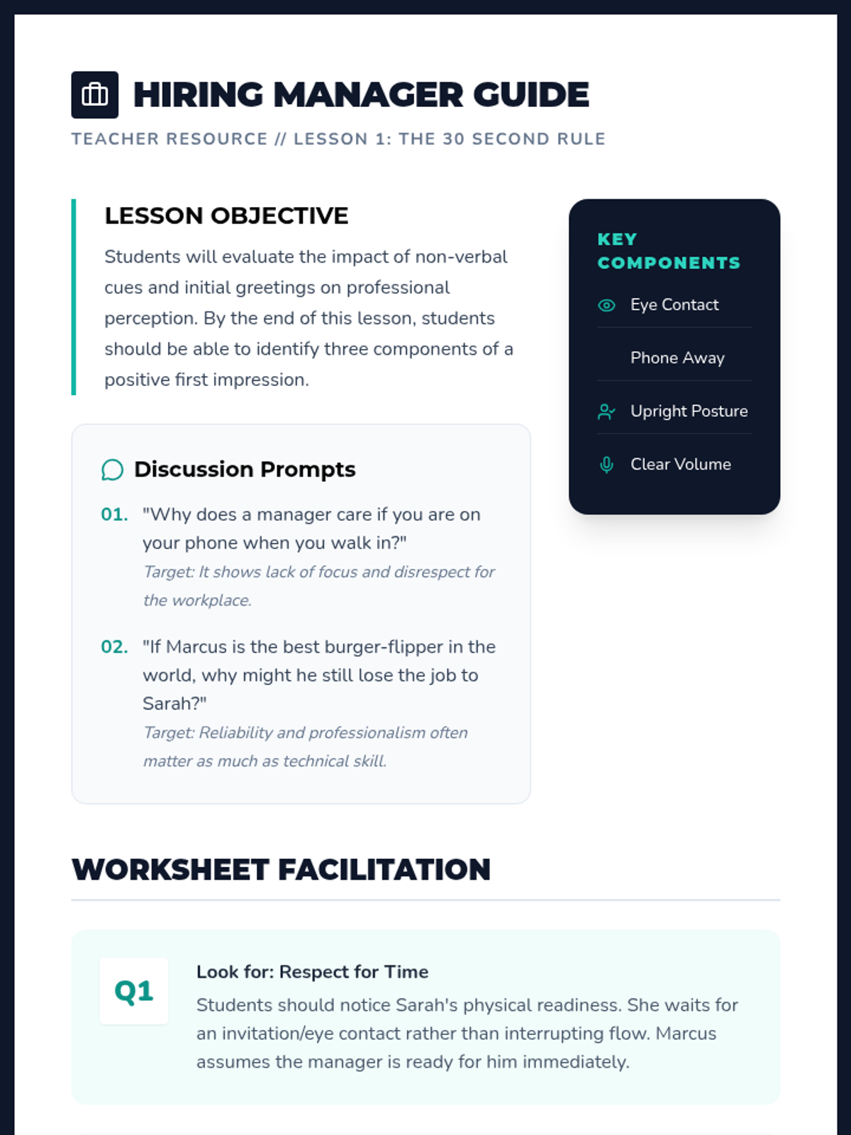 This sequence prepares transition-age students for vocational and community success by mastering context-specific greetings. Students progress from analyzing first impressions to practicing interview entrances, customer service interactions, and respectful community helper encounters, culminating in a high-stakes mock interview circuit.