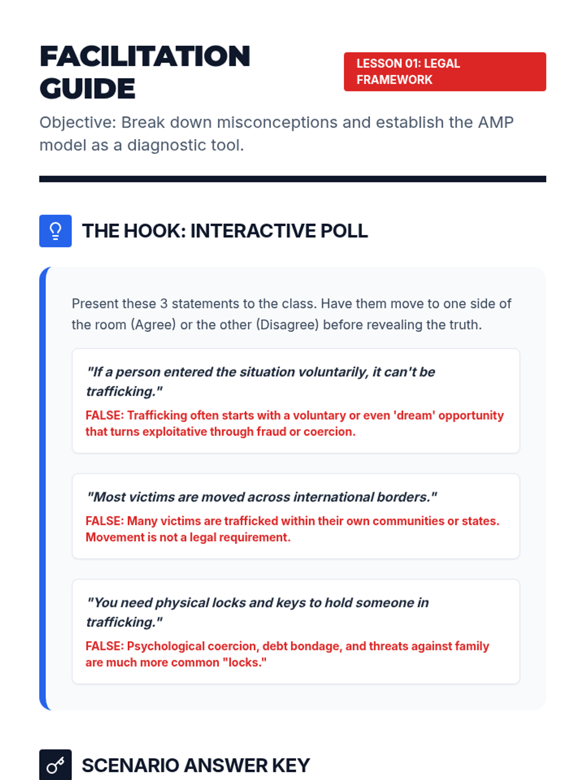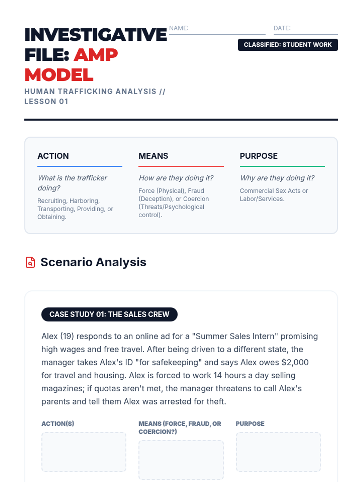 This sequence equips graduating seniors with the critical analytical skills necessary to identify and prevent human trafficking as they transition to independent living. Students analyze legal frameworks, grooming cycles, digital recruitment tactics, and labor exploitation indicators to develop actionable safety plans and reporting protocols.