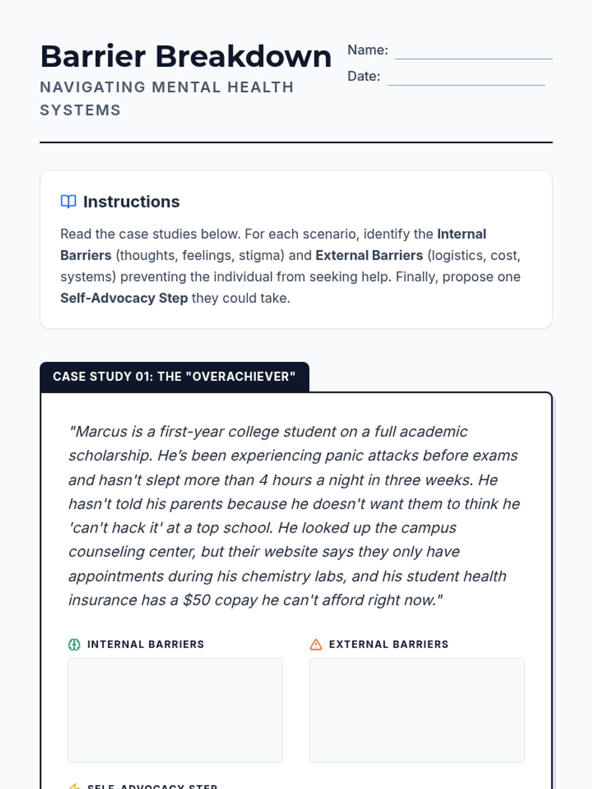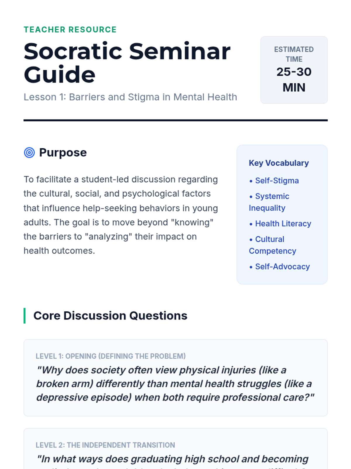 This sequence prepares seniors for the transition to independent living by demystifying the process of accessing mental healthcare without parental intervention. Students analyze systemic and psychological barriers to help-seeking, map out community and digital resources, and develop practical health literacy skills including insurance navigation and professional communication.