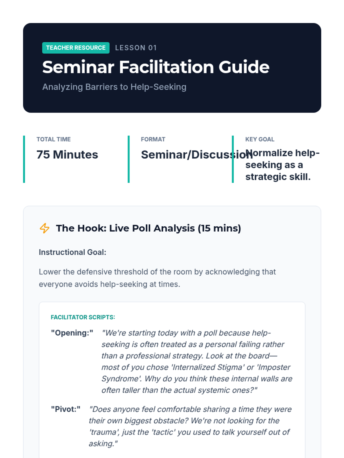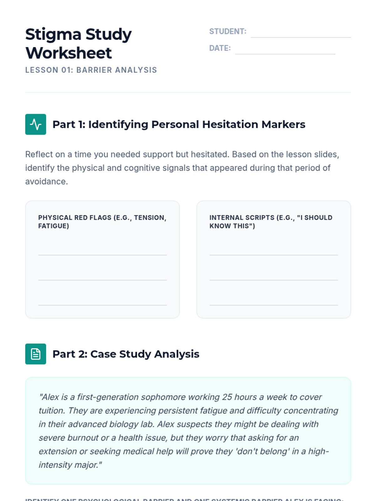 A comprehensive sequence for undergraduate students focusing on executive function and proactive support-seeking. Students move from data-driven self-analysis of energy rhythms to the creation of a long-term 'Semester Sustainability Plan' that treats mental health and support as logistical necessities.