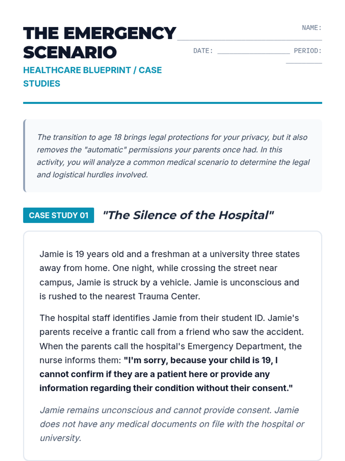 This sequence prepares graduating seniors for the transition to independent healthcare management. Students learn to navigate HIPAA, insurance, patient rights, and assertive communication in medical settings.