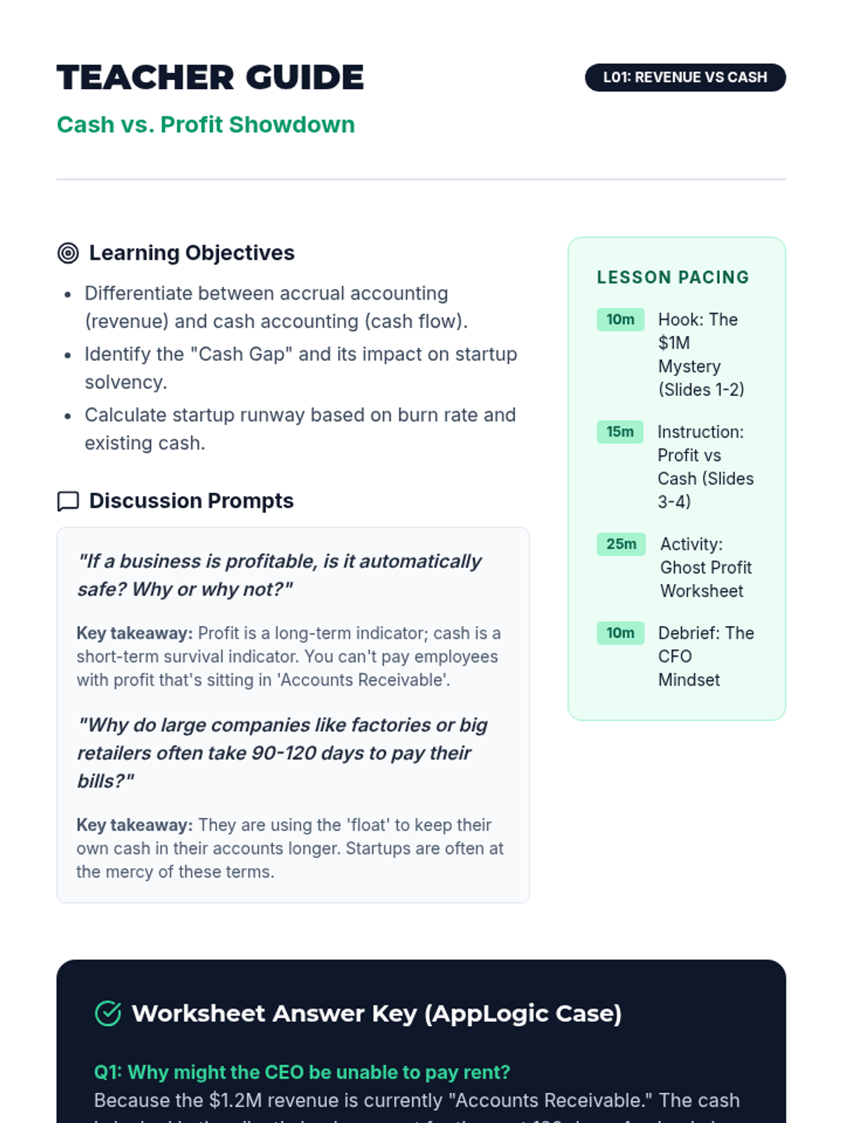 A comprehensive unit for 12th graders on the lifeblood of startups: cash flow. Students learn to distinguish profit from cash, categorize expenses, build financial statements, manage liquidity, and survive financial crises.